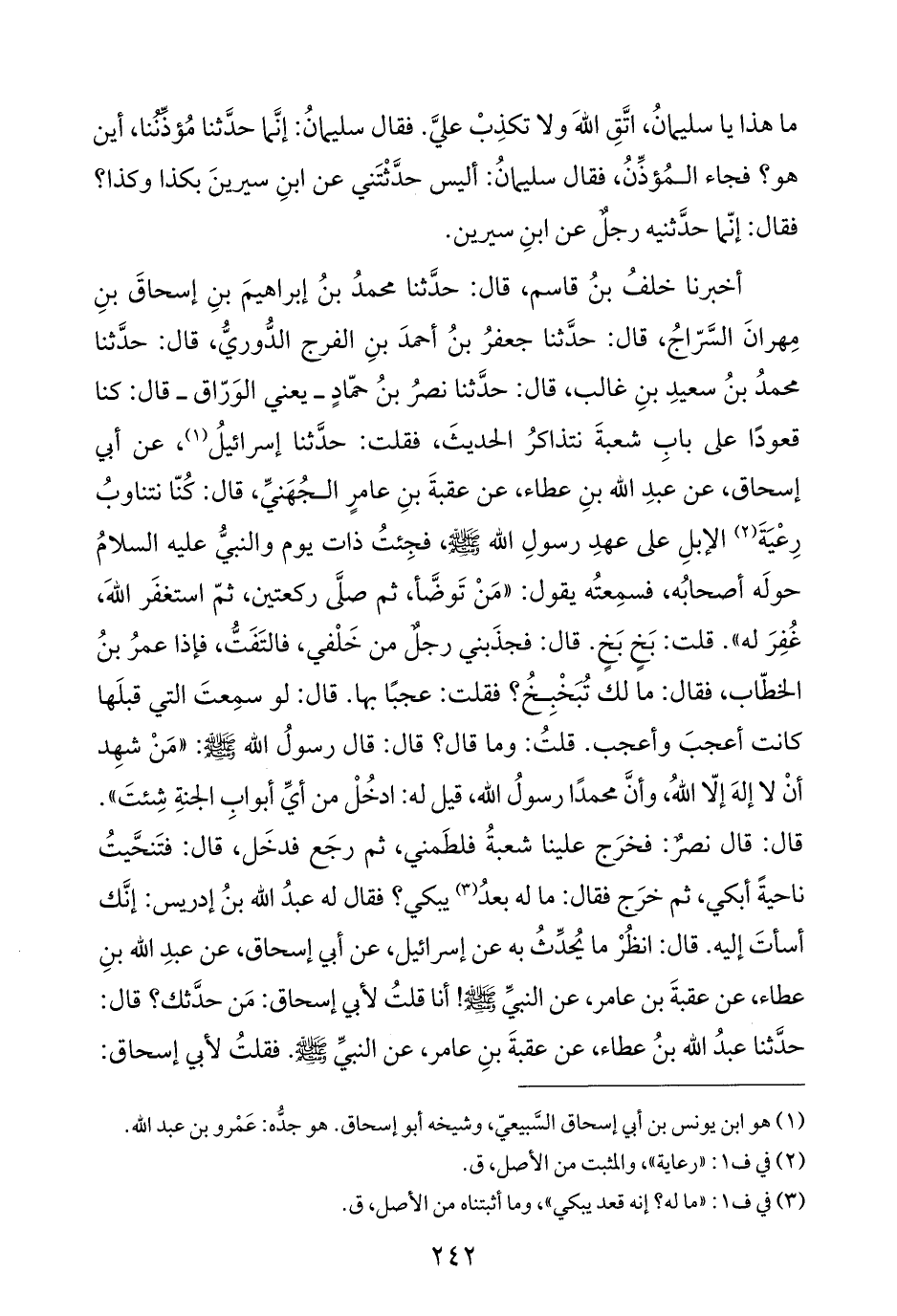 أخبرنا خلفُ بنُ قاسم، قال: حدَّثنا محمدُ بنُ إبراهيمَ بنِ إسحاقَ بنِ مِهرانَ السَّرّاجُ، قال: حدَّثنا جعفرُ بنُ أحمدَ بنِ الفرج الدُّوريُّ، قال: حدَّثنا محمدُ بنُ سعيدِ بنِ غالب، قال: حدَّثنا نصرُ بنُ حمّادٍ -يعني الوَرّاق- قال: كنا قعودًا على بابِ شعبةَ نتذاكرُ الحديثَ، فقلت: حدَّثنا إسرائيلُ (¬١)، عن أبي إسحاق، عن عبدِ اللَّه بنِ عطاء، عن عقبةَ بنِ عامرٍ الجُهَنيِّ، قال: كُنّا نتناوبُ رِعْيَةَ (¬٢) الإبلِ على عهدِ رسولِ اللَّه -صلى اللَّه عليه وسلم-، فجِئتُ ذات يوم والنبيُّ عليه السلامُ حولَه أصحابُه، فسمِعتُه يقول: "مَنْ تَوضَّأ، ثم صلَّى ركعتين، ثمّ استغفَر اللَّهَ، غُفِرَ له". قلت: بَخٍ بَخٍ. قال: فجذَبني رجلٌ من خَلْفي، فالتَفَتُّ، فإذا عمرُ بنُ الخطّاب، فقال: مالك تبخْبِخُ؟ فقلت: عجبًا بها. قال: لو سمِعتَ التي قبلَها كانت أعجبَ وأعجب. قلتُ: وما قال؟ قال: قال رسولُ اللَّه -صلى اللَّه عليه وسلم-: "مَنْ شهِد أن لا إلهَ إلّا اللَّهُ، وأنَّ محمدًا رسولُ اللَّه، قيل له: ادخُلْ من أيِّ أبوابِ الجنةِ شِئتَ". قال: قال نصرٌ: فخرَج علينا شعبةُ فلطَمني، ثم رجَع فدخَل، قال: فتَنحَّيتُ ناحيةً أبكي، ثم خرَج فقال: ما له بعدُ (¬٣) يبكي؟ فقال له عبدُ اللَّه بنُ إدريس: إنَّك أسأتَ إليه. قال: انظُرْ ما يُحدِّثُ به عن إسرائيل، عن أبي إسحاق، عن عبدِ اللَّه بنِ عطاء، عن عقبةَ بن عامر، عن النبيِّ -صلى اللَّه عليه وسلم-! أنا قلتُ لأبي إسحاق: مَن حدَّثك؟ قال: حدَّثنا عبدُ اللَّه بنُ عطاء، عن عقبةَ بنِ عامر، عن النبيِّ -صلى اللَّه عليه وسلم-. فقلتُ لأبي إسحاق: