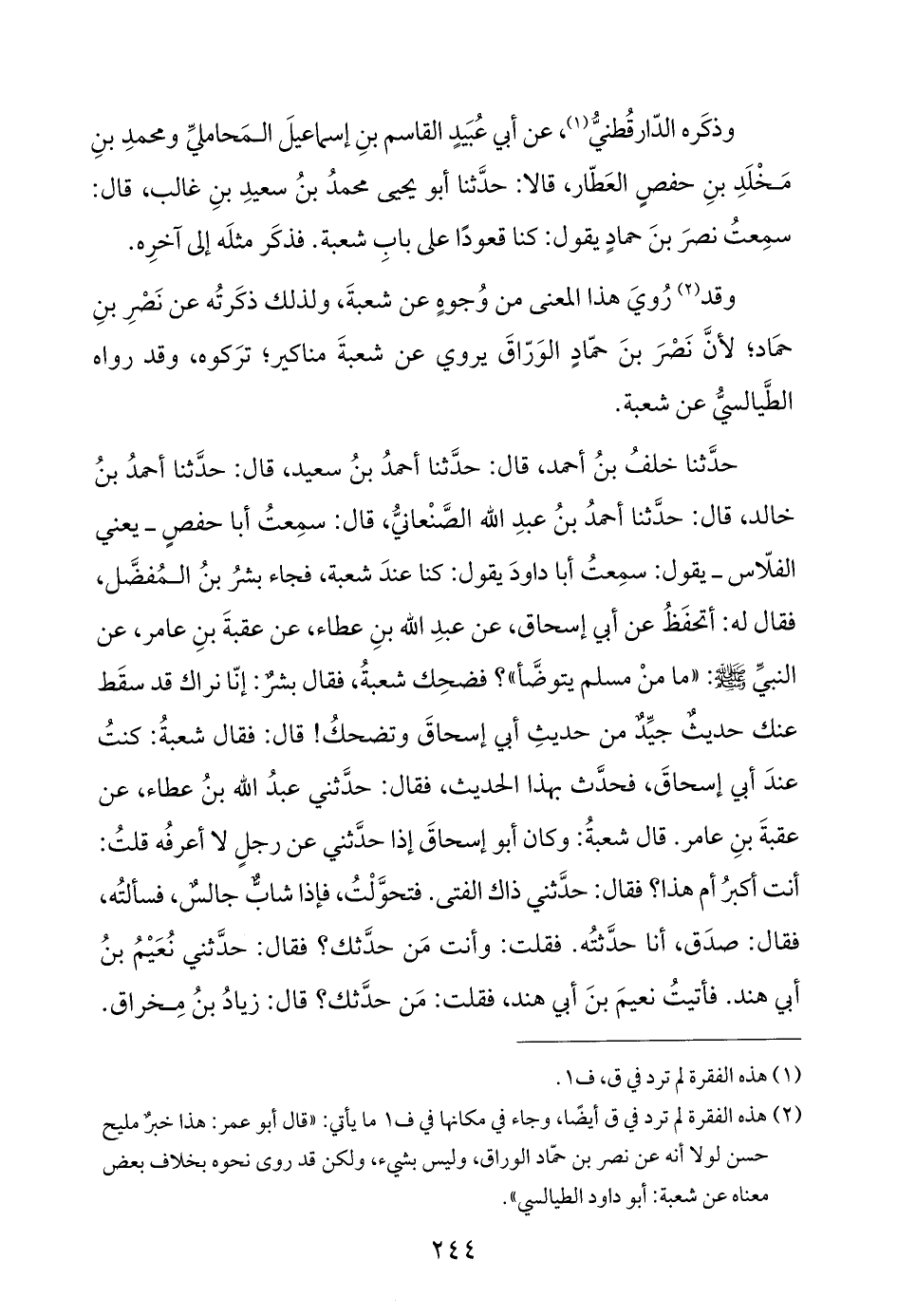 حدَّثنا خلفُ بنُ أحمد، قال: حدَّثنا أحمدُ بنُ سعيد، قال: حدَّثنا أحمدُ بنُ خالد، قال: حدَّثنا أحمدُ بنُ عبدِ اللَّه الصَّنْعانيُّ، قال: سمِعتُ أبا حفصٍ -يعني الفلّاس- يقول: سمِعتُ أبا داودَ يقول: كنا عندَ شعبة، فجاء بشرُ بنُ المُفضَّل، فقال له: أتحفَظُ عن أبي إسحاق، عن عبدِ اللَّه بنِ عطاء، عن عقبةَ بنِ عامر، عن النبيِّ -صلى اللَّه عليه وسلم-: "ما منْ مسلم يتوضَّأ"؟ فضحِك شعبةُ، فقال بشرٌ: إنّا نراك قد سقَط عنك حديثٌ جيِّدٌ من حديثِ أبي إسحاقَ وتضحكُ! قال: فقال شعبةُ: كنتُ عندَ أبي إسحاقَ، فحدَّث بهذا الحديث، فقال: حدَّثني عبدُ اللَّه بنُ عطاء، عن عقبةَ بنِ عامر. قال شعبةُ: وكان أبو إسحاقَ إذا حدَّثني عن رجلٍ لا أعرفُه قلتُ: أنت أكبرُ أم هذا؟ فقال: حدَّثني ذاك الفتى. فتحوَّلْتُ، فإذا شابٌّ جالسٌ، فسألتُه، فقال: صدَق، أنا حدَّثتُه. فقلت: وأنت مَن حدَّثك؟ فقال: حدَّثني نُعَيْمُ بنُ أبي هند. فأتيتُ نعيمَ بنَ أبي هند، فقلت: مَن حدَّثك؟ قال: زيادُ بنُ مِخراق.