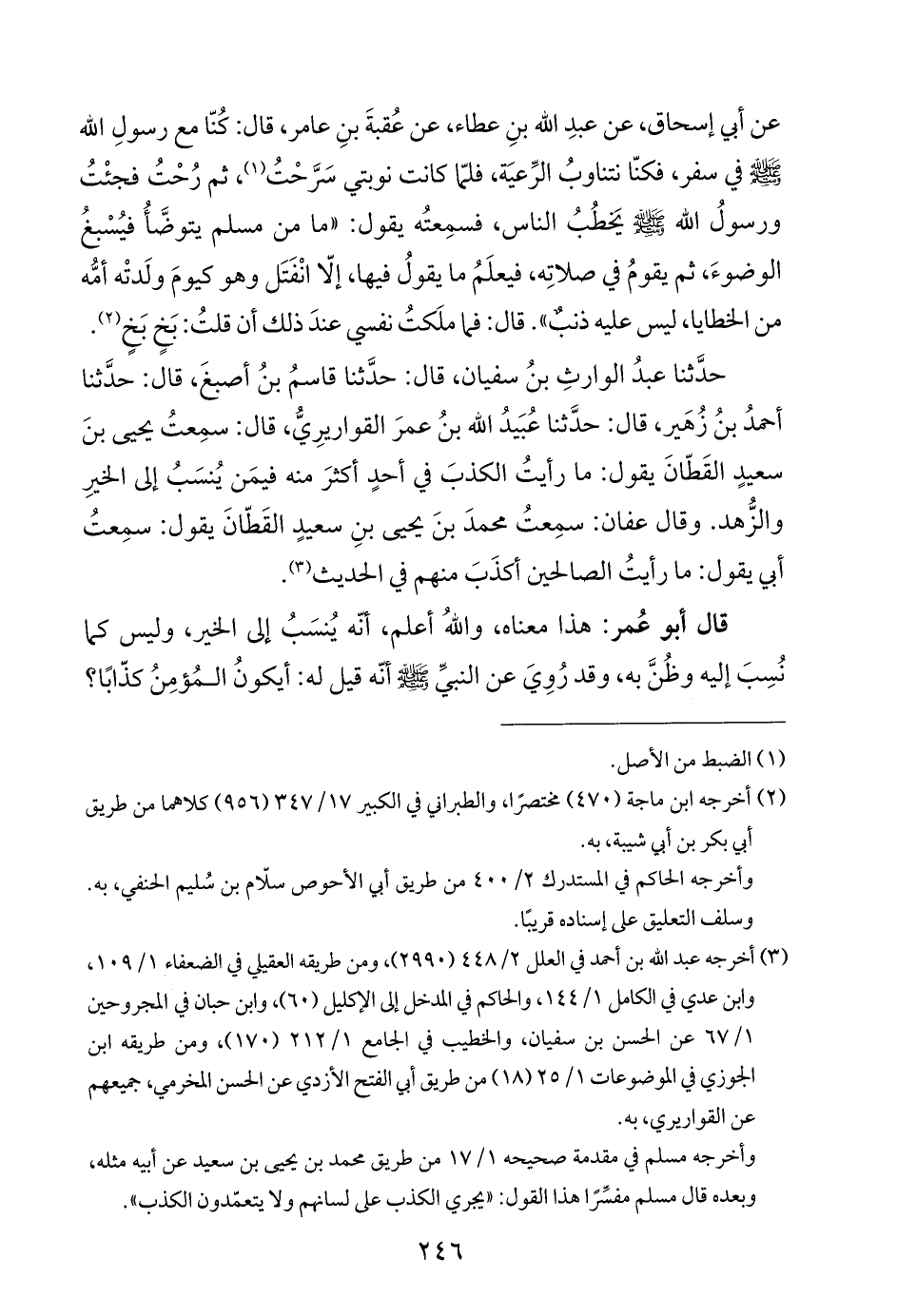 حدَّثنا عبدُ الوارثِ بنُ سفيان، قال: حدَّثنا قاسمُ بنُ أصبغَ، قال: حدَّثنا أحمدُ بنُ زُهَير، قال: حدَّثنا عُبَيدُ اللَّه بنُ عمرَ القواريرِيُّ، قال: سمِعتُ يحيى بنَ سعيدٍ القَطّانَ يقول: ما رأيتُ الكذبَ في أحدٍ أكثرَ منه فيمَن يُنسَبُ إلى الخيرِ والزُّهد. وقال عفان: سمِعتُ محمدَ بنَ يحيى بنِ سعيدٍ القَطّانَ يقول: سمِعتُ أبي يقول: ما رأيتُ الصالحين أكذَبَ منهم في الحديث (¬٣).