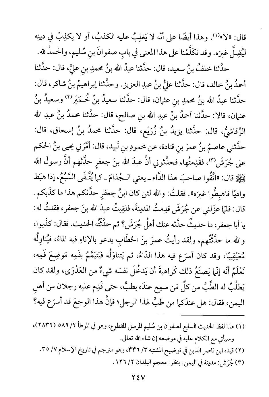 حدَّثنا خلفُ بنُ سعيد، قال: حدَّثنا عبدُ اللَّه بنُ محمدِ بنِ عليٍّ، قال: حدَّثنا أحمدُ بنُ خالد، قال: حدَّثنا عليُّ بنُ عبدِ العزيز. وحدَّثنا إبراهيمُ بنُ شاكر، قال: حدَّثنا عبدُ اللَّه بنُ محمدِ بنِ عثمان، قال: حدَّثنا سعيدُ بنُ خُمَيْر (¬٢) وسعيدُ بنُ عثمان، قالا: حدَّثنا أحمدُ بنُ عبدِ اللَّه بنِ صالح، قال: حدَّثنا محمدُ بنُ عبدِ اللَّه الرَّقاشيُّ، قال: حدَّثنا يزيدُ بنُ زُرَيْع، قال: حدَّثنا محمدُ بنُ إسحاق، قال: حدَّثني عاصمُ بنُ عمرَ بنِ قتادة، عن محمودِ بنِ لَبيد، قال: أمَّرَني يحيى بنُ الحكم على جُرَشَ (¬٣)، فقَدِمتُها، فحدَّثوني أنَّ عبدَ اللَّه بنَ جعفرٍ حدَّثهم أنَّ رسولَ اللَّه -صلى اللَّه عليه وسلم- قال: "اتَّقُوا صاحبَ هذا الدَّاء -يعني الجُذامَ- كما يُتَّقَى السَّبُعُ، إذا هبَط واديًا فاهبِطُوا غيرَه". فقلتُ: واللَّه لئن كان ابنُ جعفرٍ حدَّثكم هذا ما كذَبكم. قال: فلمَّا عزَلني عن جُرَشَ قدِمتُ المدينةَ، فلقِيتُ عبدَ اللَّه بنَ جعفر، فقلتُ له: يا أبا جعفر، ما حديثٌ حدَّثه عنك أهلُ جُرَشَ؟ ثم حدَّثْتُه الحديث. فقال: كذَبوا، واللَّه ما حدَّثْتُهم، ولقد رأيتُ عمرَ بنَ الخطّابِ يدعو بالإناءِ فيه الماءُ، فيُناوِلُه مُعَيْقِيبًا، وقد كان أسرَع فيه هذا الدّاءُ، ثم يَتناوَلُه فيَتيَمَّمُ بفَمِه مَوضِعَ فَمِه، نَعْلَمُ أَنَّه إنَّما يَصنَعُ ذلك كَراهيةَ أن يَدخُلَ نفسَه شيءٌ من العَدْوَى، ولقد كان يَطلُبُ له الطِّبَّ من كلِّ مَن سمِع عندَه بطبٍّ، حتى قَدِم عليه رجلان من أهلِ اليمن، فقال: هل عندَكما من طبٍّ لهذا الرجل؛ فإنَّ هذا الوجعَ قد أسرَع فيه؟