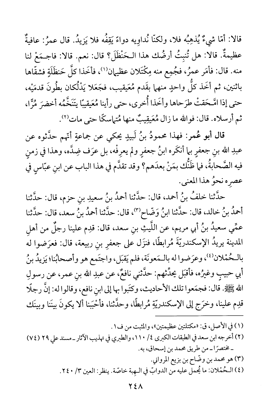 حدَّثنا خلفُ بنُ أحمد، قال: حدَّثنا أحمدُ بنُ سعيدِ بنِ حزم، قال: حدَّثنا أحمدُ بنُ خالد، قال: حدَّثنا ابنُ وَضّاح (¬٣)، قال: حدَّثنا أحمدُ بنُ سعد، قال: حدَّثنا عمِّي سعيدُ بنُ أبي مريم، عن اللَّيثِ بنِ سعد، قال: قدِم علينا رجلٌ من أهلِ المدينة يريدُ الإسكندريّةَ مُرابطًا، فنزَل على جعفرِ بنِ ربيعة، قال: فعرَضوا له بالحُمْلان (¬٤)، وعرَضوا له بالمَعونَة، فلم يَقبَل، واجتَمع هو وأصحابُنا؛ يَزيدُ بنُ أبي حبيبٍ وغيرُه، فأقبَل يحدِّثهم: حدَّثني نافعٌ، عن عبدِ اللَّه بنِ عمر، عن رسولِ اللَّه -صلى اللَّه عليه وسلم-. قال: فجمَعوا تلك الأحاديث، وكتَبوا بها إلى ابنِ نافع، وقالوا له: إنَّ رجلًا قدِم علينا، وخرَج إلى الإسكندريّةِ مُرابطًا، وحدَّثنا، فأحْبَبنا ألا يكونَ بينَنا وبينَك