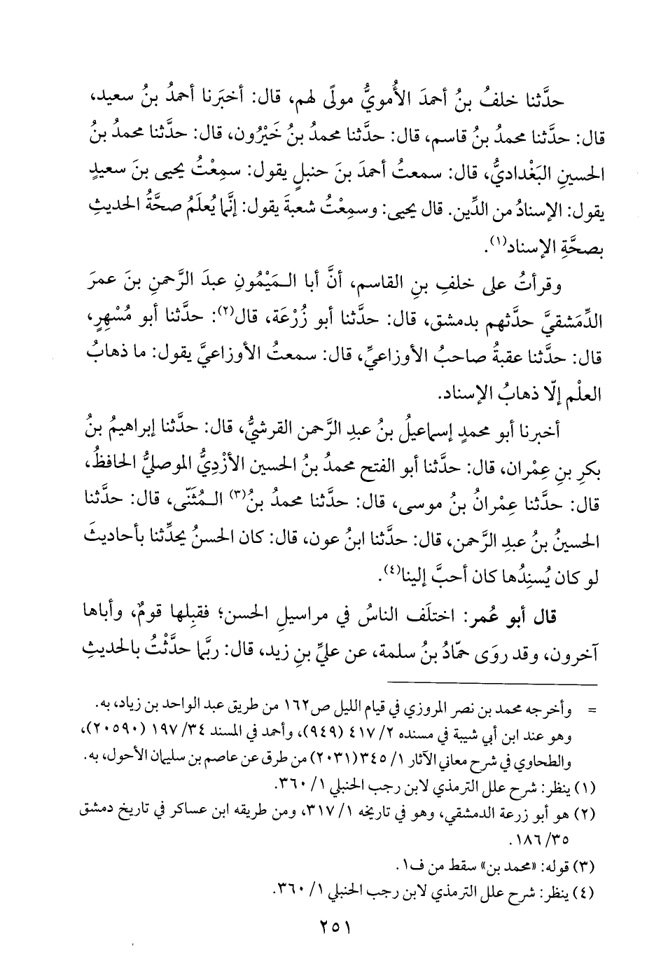 حدَّثنا خلفُ بنُ أحمدَ الأُمويُّ مولًى لهم، قال: أخبَرنا أحمدُ بنُ سعيد، قال: حدَّثنا محمدُ بنُ قاسم، قال: حدَّثنا محمدُ بنُ خَيْرُون، قال: حدَّثنا محمدُ بنُ الحسينِ البَغْداديُّ، قال: سمعتُ أحمدَ بنَ حنبلٍ يقول: سمِعْتُ يحيى بنَ سعيدٍ يقول: الإسنادُ من الدِّين. قال يحيى: وسمِعْتُ شعبةَ يقول: إنَّما يُعلَمُ صحَّةُ الحديثِ بصحَّةِ الإسناد (¬١).