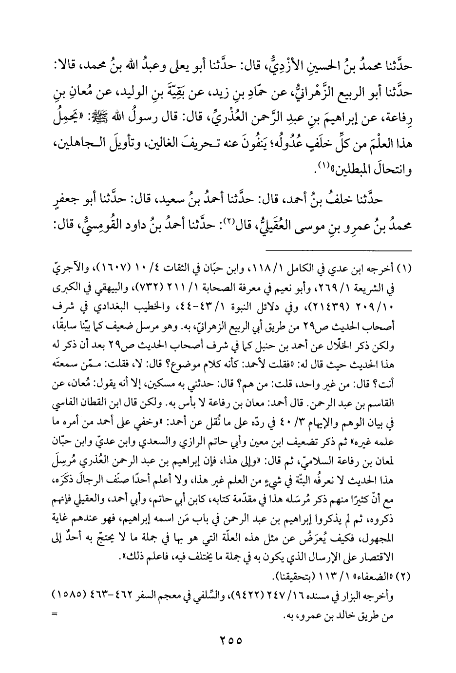 حدَّثنا محمدُ بنُ الحسينِ الأزْدِيُّ، قال: حدَّثنا أبو يعلى وعبدُ اللَّه بنُ محمد، قالا: حدَّثنا أبو الربيع الزَّهْرانيُّ، عن حمّادِ بنِ زيد، عن بَقِيَّةَ بنِ الوليد، عن مُعانِ بنِ رِفاعة، عن إبراهيمَ بنِ عبدِ الرَّحمن العُذْريِّ، قال: قال رسولُ اللَّه -صلى اللَّه عليه وسلم-: "يَحمِلُ هذا العلْمَ من كلِّ خلَفٍ عُدُولُه؛ يَنفُونَ عنه تحريفَ الغالين، وتأويلَ الجاهلين، وانتحالَ المبطلين" (¬١).