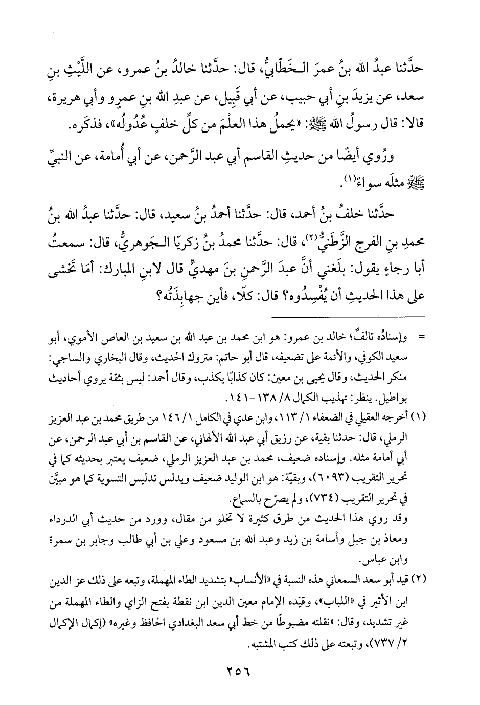حدَّثنا عبدُ اللَّه بنُ عمرَ الخَطّابيُّ، قال: حدَّثنا خالدُ بنُ عمرو، عن اللَّيْثِ بنِ سعد، عن يزيدَ بنِ أبي حبيب، عن أبي قَبِيل، عن عبدِ اللَّه بنِ عمرٍو وأبي هريرة، قالا: قال رسولُ اللَّه -صلى اللَّه عليه وسلم-: "يحملُ هذا العلْمَ من كلِّ خلفٍ عُدُولُه"، فذكَره.