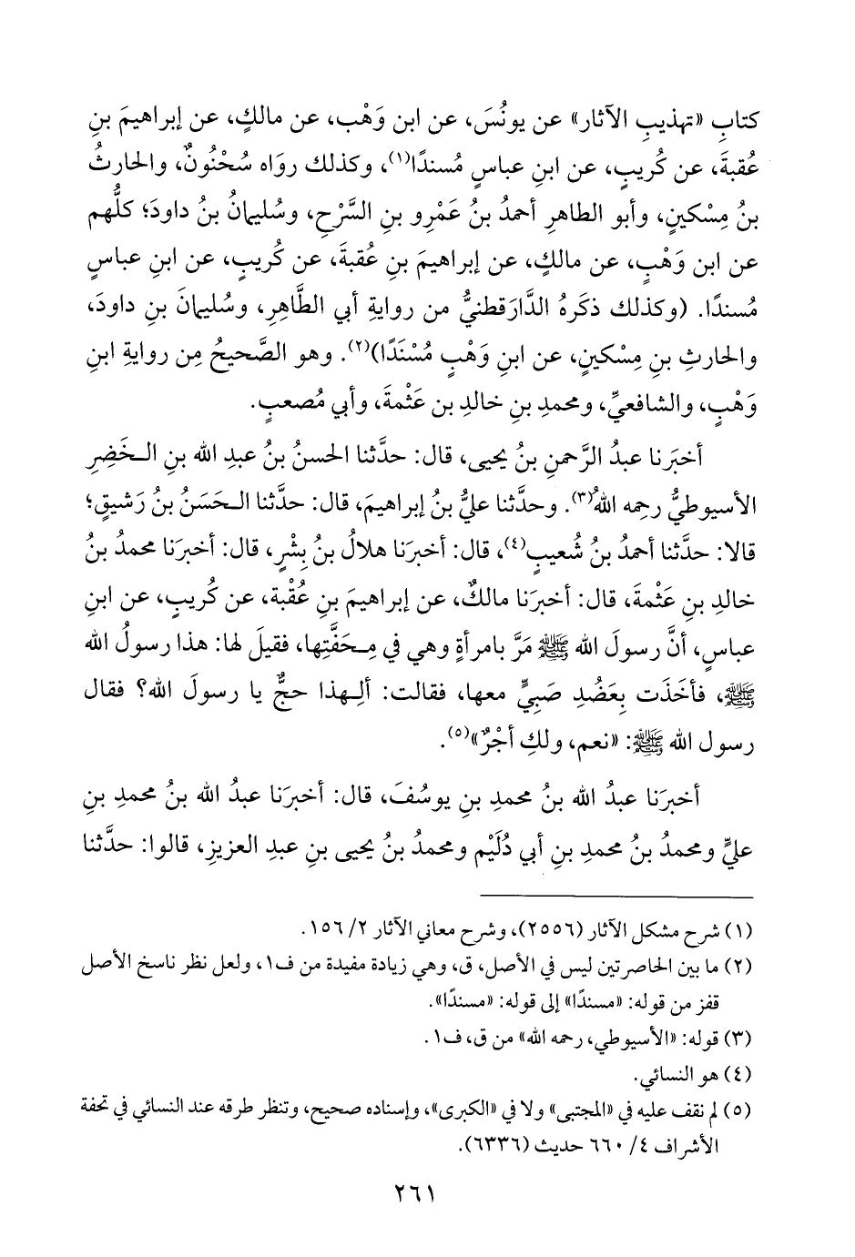 أخبَرنا عبدُ الرَّحمنِ بنُ يحيى، قال: حدَّثنا الحسنُ بنُ عبدِ اللَّه بنِ الخَضِرِ الأسيوطيُّ رحِمه اللَّهُ (¬٣). وحدَّثنا عليُّ بنُ إبراهيمَ، قال: حدَّثنا الحَسَنُ بنُ رَشيقٍ؛ قالا: حدَّثنا أحمدُ بنُ شُعيبٍ (¬٤)، قال: أخبرَنا هلالُ بنُ بِشْرٍ، قال: أخبرَنا محمدُ بنُ خالدِ بنِ عَثْمةَ، قال: أخبرَنا مالكٌ، عن إبراهيمَ بنِ عُقْبة، عن كُريبٍ، عن ابنِ عباسٍ، أنَّ رسولَ اللَّه -صلى اللَّه عليه وسلم- مَرَّ بامرأةٍ وهي في مِحَفَّتِها، فقيلَ لها: هذا رسولُ اللَّه -صلى اللَّه عليه وسلم-، فأخَذَت بِعَضُدِ صَبِيٍّ معها، فقالت: ألِهذا حجٌّ يا رسولَ اللَّه؟ فقال رسول اللَّه -صلى اللَّه عليه وسلم-: "نعم، ولكِ أجْرٌ" (¬٥).