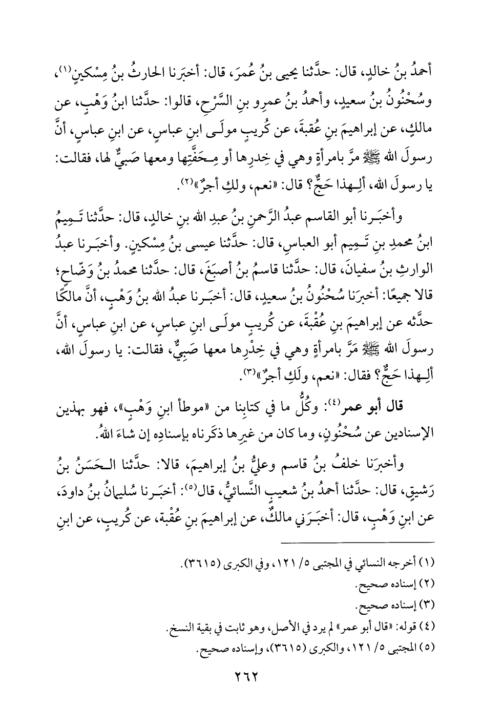 أحمدُ بنُ خالدٍ، قال: حدَّثنا يحيى بنُ عُمرَ، قال: أخبَرنا الحارثُ بنُ مِسْكينٍ (¬١)، وسُحْنُونُ بنُ سعيدٍ، وأحمدُ بنُ عمرِو بنِ السَّرْحِ، قالوا: حدَّثنا ابنُ وَهْبٍ، عن مالكٍ، عن إبراهيمَ بنِ عُقبةَ، عن كُريبٍ مولَى ابنِ عباسٍ، عن ابنِ عباسٍ، أنَّ رسولَ اللَّه -صلى اللَّه عليه وسلم- مرَّ بامرأةٍ وهي في خِدرِها أو مِحَفَّتِها ومعها صبيٌّ لها، فقالت: يا رسولَ اللَّه، ألِهذا حَجٌّ؟ قال: "نعم، ولكِ أجرٌ" (¬٢).