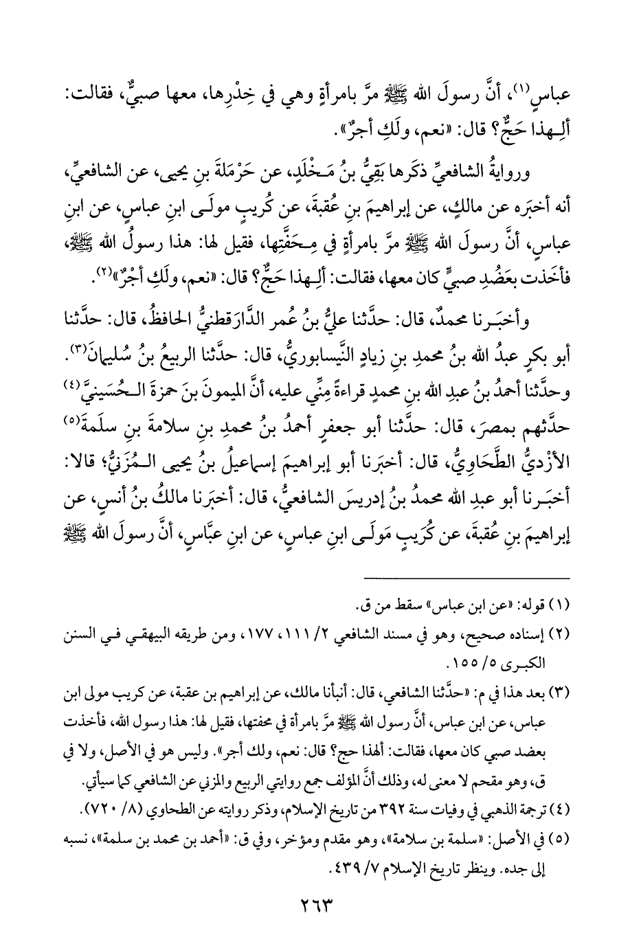 وروايةُ الشافعيِّ ذكَرها بَقِيُّ بنُ مَخْلَدٍ، عن حَرْمَلةَ بنِ يحيى، عن الشافعيِّ، أنه أخبَره عن مالكٍ، عن إبراهيمَ بنِ عُقبةَ، عن كُريبٍ مولَى ابنِ عباسٍ، عن ابنِ عباسٍ، أنَّ رسولَ اللَّه -صلى اللَّه عليه وسلم- مرَّ بامرأةٍ في مِحَفَّتِها، فقيل لها: هذا رسولُ اللَّه -صلى اللَّه عليه وسلم-، فأخَذت بعَضُدِ صبيٍّ كان معها، فقالت: ألِهذا حَجٌّ؟ قال: "نعم، ولَكِ أجْرٌ" (¬٢).
