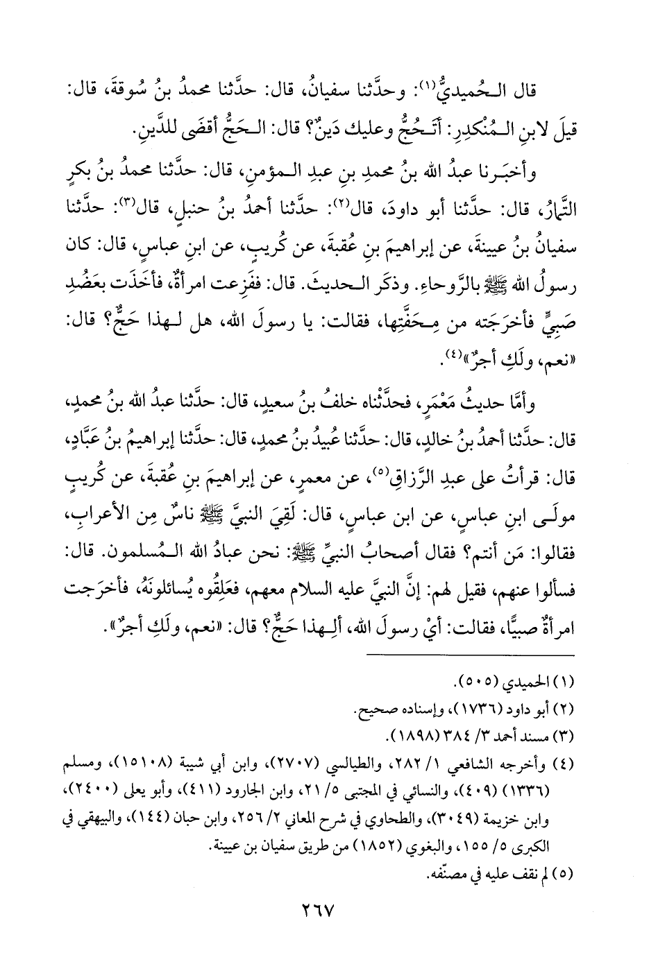 وأخبَرنا عبدُ اللَّه بنُ محمدِ بنِ عبدِ المؤمنِ، قال: حدَّثنا محمدُ بنُ بكرٍ التَّمارُ، قال: حدَّثنا أبو داودَ، قال (¬٢): حدَّثنا أحمدُ بنُ حنبلٍ، قال (¬٣): حدَّثنا سفيانُ بنُ عيينةَ، عن إبراهيمَ بنِ عُقبةَ، عن كُريبٍ، عن ابنِ عباسٍ، قال: كان رسولُ اللَّه -صلى اللَّه عليه وسلم- بالرَّوحاءِ. وذكَر الحديثَ. قال: ففَزِعت امرأةٌ، فأخَذَت بعَضدِ صَبِيٍّ فأخرَجَته من مِحَفَّتِها، فقالت: يا رسولَ اللَّه، هل لهذا حَجٌّ؟ قال: " نعم، ولَكِ أجرٌ" (¬٤).