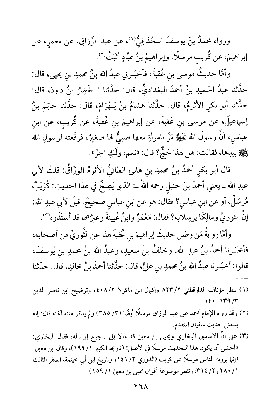 قال أبو بكرٍ أحمدُ بنُ محمدِ بنِ هانئ الطائيُّ الأثرمُ الورَّاقُ: قلتُ لأبي عبدِ اللَّه -يعني أحمدَ بنَ حنبلٍ رحمه اللَّهُ-: الذي يَصِحُّ في هذا الحديثِ: كُرَيْبٌ مُرسَلٌ، أو عن ابنِ عباسٍ؟ فقال: هو عن ابنِ عباسٍ صحيحٌ. قيلَ لأبي عبدِ اللَّه: إنَّ الثوريَّ ومالِكًا يرسِلانِه؟ فقال: مَعْمَرٌ وابنُ عُيينةَ وغيرُهما قد أسنَدُوه (¬٣).