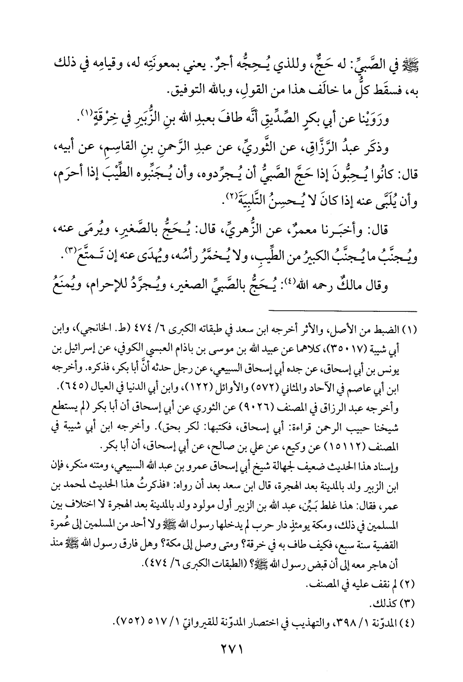 وذكَر عبدُ الرَّزَّاقِ، عن الثَّوريِّ، عن عبدِ الرَّحمنِ بنِ القاسِمِ، عن أبيه، قال: كانُوا يُحِبُّونَ إذا حَجَّ الصَّبيُّ أن يُجرِّدوه، وأن يُجَنِّبوه الطِّيْبَ إذا أحرَم، وأن يُلَبَّى عنه إذا كانَ لا يُحسِنُ التَّلبِيَةَ (¬٢).