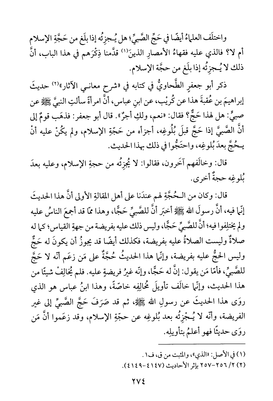 ذكر أبو جعفرٍ الطَّحاويُّ في كتابه في "شرح معاني الآثار" (¬٢) حديثَ إبراهيمَ بن عُقبةَ هذا عن كُريْب، عن ابنِ عباس، أنَّ امرأةً سألتِ النبيَّ -صلى اللَّه عليه وسلم- عن صبيٍّ: هل لهذا حَجٌّ؟ فقال: "نعم، ولكِ أجرٌ". قال أبو جعفر: فذهَب قومٌ إلى أنَّ الصَّبيَّ إذا حَجَّ قبلَ بُلُوغِه، أجزأه من حَجّةِ الإسلام، ولم يكُنْ عليه أنْ يحُجَّ بعدَ بُلوغِه، واحتَجُّوا في ذلك بهذا الحديث.