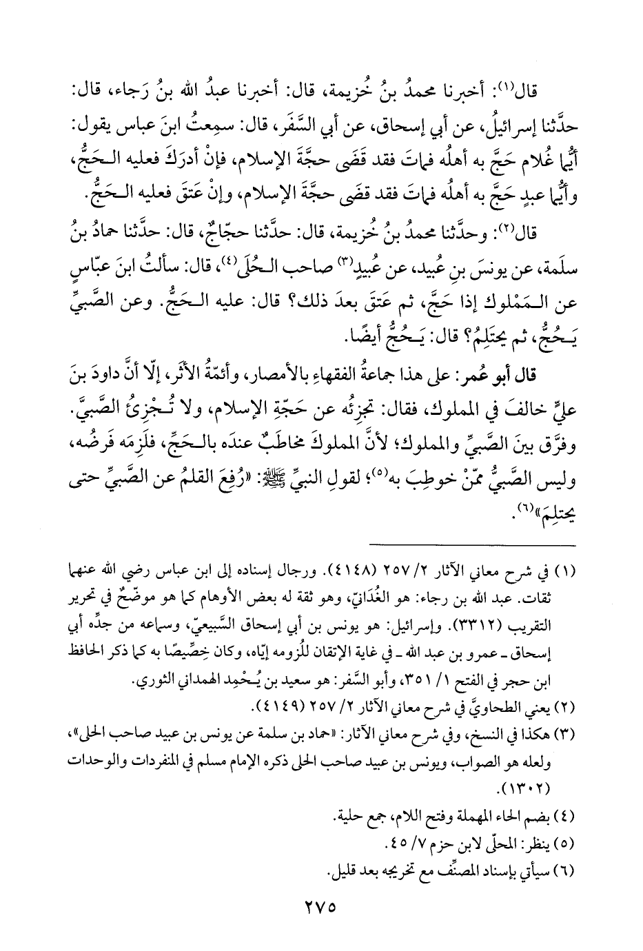 قال (¬٢): وحدَّثنا محمدُ بنُ خُزيمة، قال: حدَّثنا حجّاجٌ، قال: حدَّثنا حمادُ بنُ سلَمة، عن يونسَ بنِ عُبيد، عن عُبيدٍ (¬٣) صاحب الحُلَى (¬٤)، قال: سألتُ ابنَ عبّاسٍ عن المَمْلوك إذا حَجَّ، ثم عَتقَ بعدَ ذلك؟ قال: عليه الحَجُّ. وعن الصَّبيِّ يَحُجُّ، ثم يحتَلِمُ؟ قال: يَحُجُّ أيضًا.