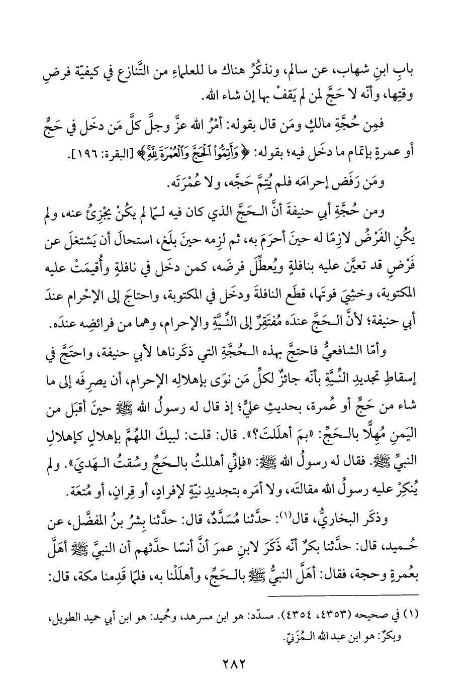 وأمّا الشافعيُّ فاحتجَّ بهذه الحُجَّةِ التي ذكَرناها لأبي حنيفة، واحتَجَّ في إسقاطِ تجديدِ النِّيَّةِ بأنّه جائز لكلِّ مَن نوَى بإهلالِه الإحرام، أن يصرِفَه إلى ما شاء من حَجٍّ أو عُمرة، بحديثِ عليٍّ؛ إذ قال له رسولُ اللَّه -صلى اللَّه عليه وسلم- حينَ أقبَل من اليَمنِ مُهِلًّا بالحَجِّ: "بمَ أهلَلتَ؟ ". قال: قلت: لبيكَ اللهُمَّ بإهلالٍ كإهلالِ النبيِّ -صلى اللَّه عليه وسلم-. فقال له رسولُ اللَّه -صلى اللَّه عليه وسلم-: "فإنِّي أهللتُ بالحَجِّ وسُقتُ الهَديَ". ولم يُنكِرْ عليه رسولُ اللَّه مقالتَه، ولا أمَره بتجديدِ نيّةٍ لإفرادٍ، أو قِرانٍ، أو مُتعَة.