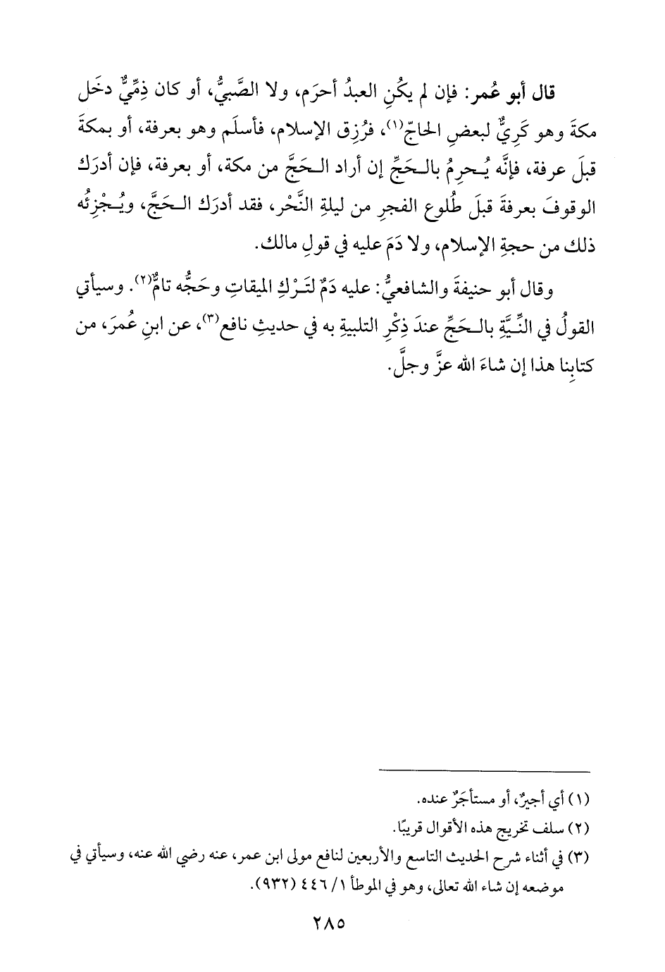 وقال أبو حنيفةَ والشافعيُّ: عليه دَمٌ لتَرْكِ الميقاتِ وحَجُّه تامٌّ (¬٢). وسيأتي القولُ في النِّيَّةِ بالحَجِّ عندَ ذِكْرِ التلبيةِ به في حديثِ نافع (¬٣)، عن ابنِ عُمرَ، من كتابِنا هذا إن شاءَ اللَّه عزَّ وجلَّ.