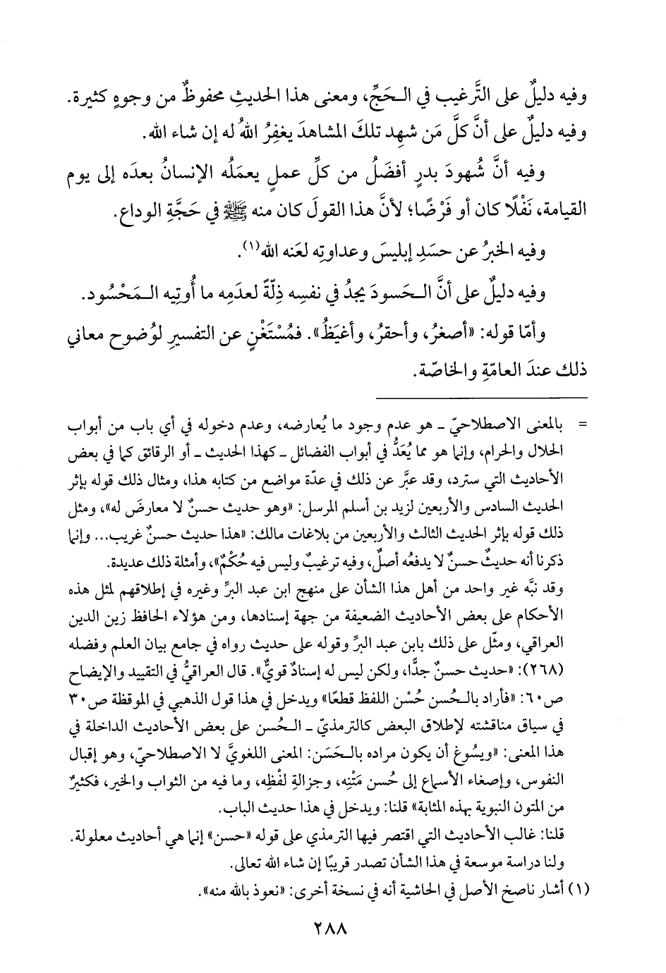 = بالمعنى الاصطلاحيّ- هو عدم وجود ما يُعارضه، وعدم دخوله في أي باب من أبواب الحلال والحرام، وإنما هو مما يُعَدُّ في أبواب الفضائل -كهذا الحديث- أو الرقائق كما في بعض الأحاديث التي سترد، وقد عبَّر عن ذلك في عدّة مواضع من كتابه هذا، ومثال ذلك قوله بإثر الحديث السادس والأربعين لزيد بن أسلم المرسل: "وهو حديث حسنٌ لا معارضَ له"، ومثل ذلك قوله بإثر الحديث الثالث والأربعين من بلاغات مالك: "هذا حديث حسنٌ غريب. . . وإنما ذكرنا أنه حديثٌ حسنٌ لا يدفعُه أصلٌ، وفيه ترغيبٌ وليس فيه حُكْمٌ"، وأمثلة ذلك عديدة.