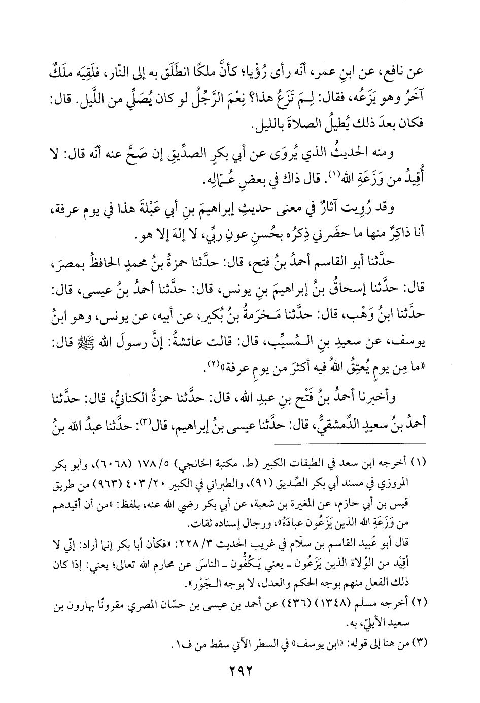 حدَّثنا أبو القاسم أحمدُ بنُ فتح، قال: حدَّثنا حمزةُ بنُ محمدٍ الحافظُ بمصرَ، قال: حدَّثنا إسحاقُ بنُ إبراهيمَ بنِ يونس، قال: حدَّثنا أحمدُ بنُ عيسى، قال: حدَّثنا ابنُ وَهْب، قال: حدَّثنا مَخرَمةُ بنُ بُكير، عن أبيه، عن يونس، وهو ابنُ يوسف، عن سعيدِ بنِ المُسيِّب، قال: قالت عائشةُ: إنَّ رسولَ اللَّه -صلى اللَّه عليه وسلم- قال: "ما مِن يومٍ يُعتِقُ اللَّهُ فيه أكثرَ من يومِ عرفة" (¬٢).