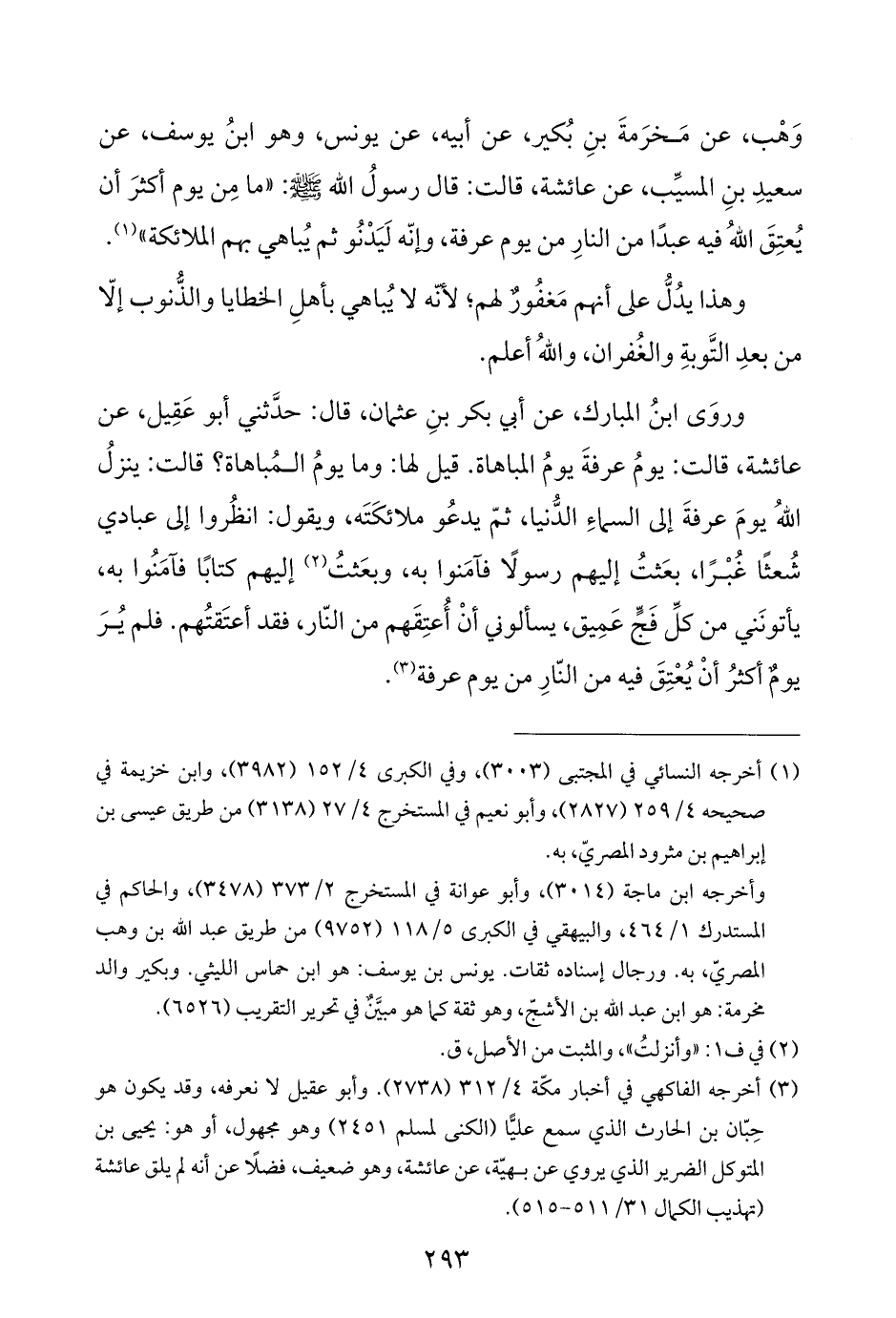 وَهْب، عن مَخرَمةَ بنِ بُكير، عن أبيه، عن يونس، وهو ابنُ يوسف، عن سعيدِ بنِ المسيِّب، عن عائشة، قالت: قال رسولُ اللَّه -صلى اللَّه عليه وسلم-: "ما مِن يوم أكثرَ أن يُعتِقَ اللَّهُ فيه عبدًا من النارِ من يوم عرفة، وإنّه لَيَدْنُو ثم يُباهي بهم الملائكة" (¬١).