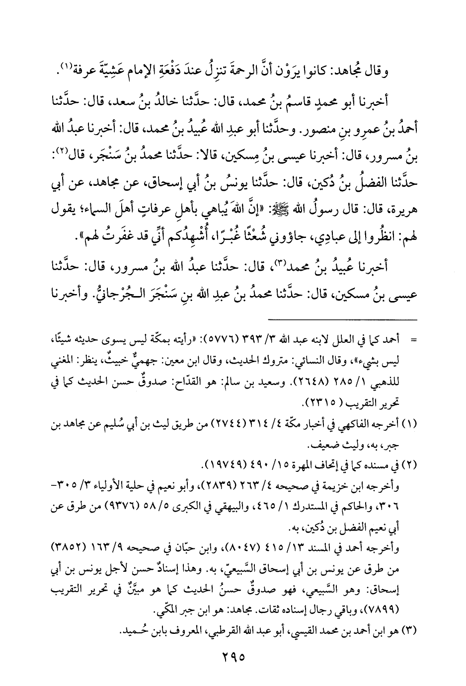 أخبرنا أبو محمدٍ قاسمُ بنُ محمد، قال: حدَّثنا خالدُ بنُ سعد، قال: حدَّثنا أحمدُ بنُ عمرِو بنِ منصور. وحدَّثنا أبو عبدِ اللَّه عُبيدُ بنُ محمد، قال: أخبرنا عبدُ اللَّه بنُ مسرور، قال: أخبرنا عيسى بنُ مِسكين، قالا: حدَّثنا محمدُ بنُ سَنْجَر، قال (¬٢): حدَّثنا الفضلُ بنُ دُكين، قال: حدَّثنا يونسُ بنُ أبي إسحاق، عن مجاهد، عن أبي هريرة، قال: قال رسولُ اللَّه -صلى اللَّه عليه وسلم-: "إنَّ اللَّهَ يُباهي بأهلِ عرفاتٍ أهلَ السماء؛ يقول لهم: انظُروا إلى عبادِي، جاؤوني شُعْثًا غُبْرًا، أُشْهِدُكم أنِّي قد غفَرتُ لهم".