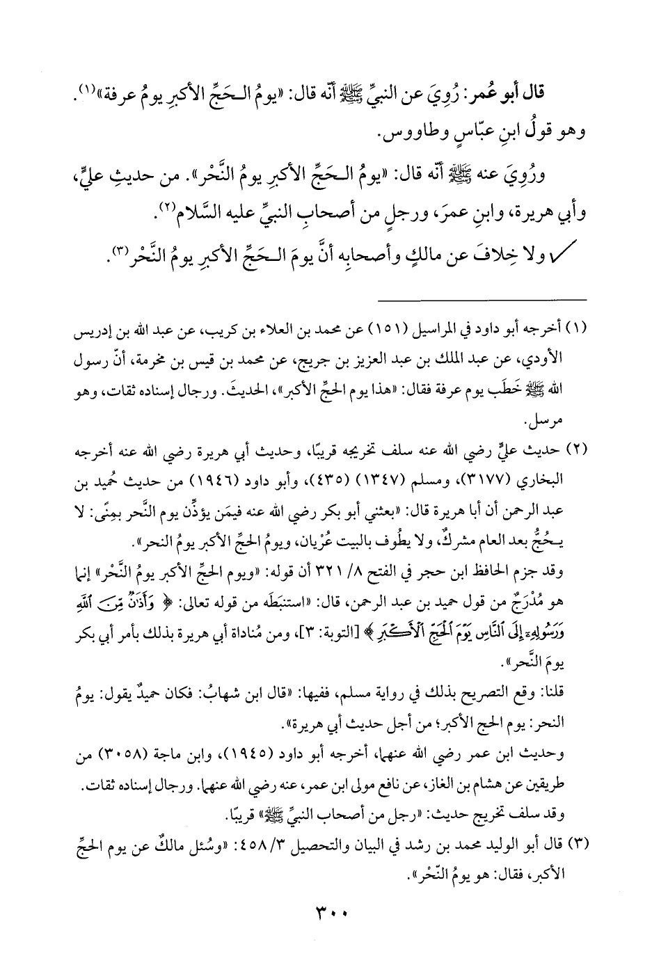 ورُوِيَ عنه -صلى اللَّه عليه وسلم- أنَّه قال: "يومُ الحَجِّ الأكبرِ يومُ النَّحْر". من حديثِ عليٍّ، وأبي هريرة، وابنِ عمرَ، ورجلٍ من أصحابِ النبيِّ عليه السَّلام (¬٢).