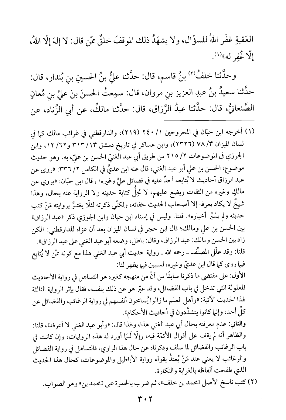 والثاني: عدم معرفته بحال أبي عبد الغني هذا، ولهذا قال: "وأبو عبد الغني لا أعرفه"، قلنا: والظاهر أنه لم يقف على أقوال الأئمّة فيه، وإلّا لَمَا أورد له هذه الروايات، وإن كانت في باب الرغائب والفضائل لما سلف وذكرناه عن حال هذا الراوي، فالتساهل في رواية الفضائل والرغائب لا يعني عند مَنْ يُعتدُّ بقوله رواية الأباطيل والموضوعات، كحال هذا الحديث الذي طفحت ألفاظه بالغرابة والنكارة.