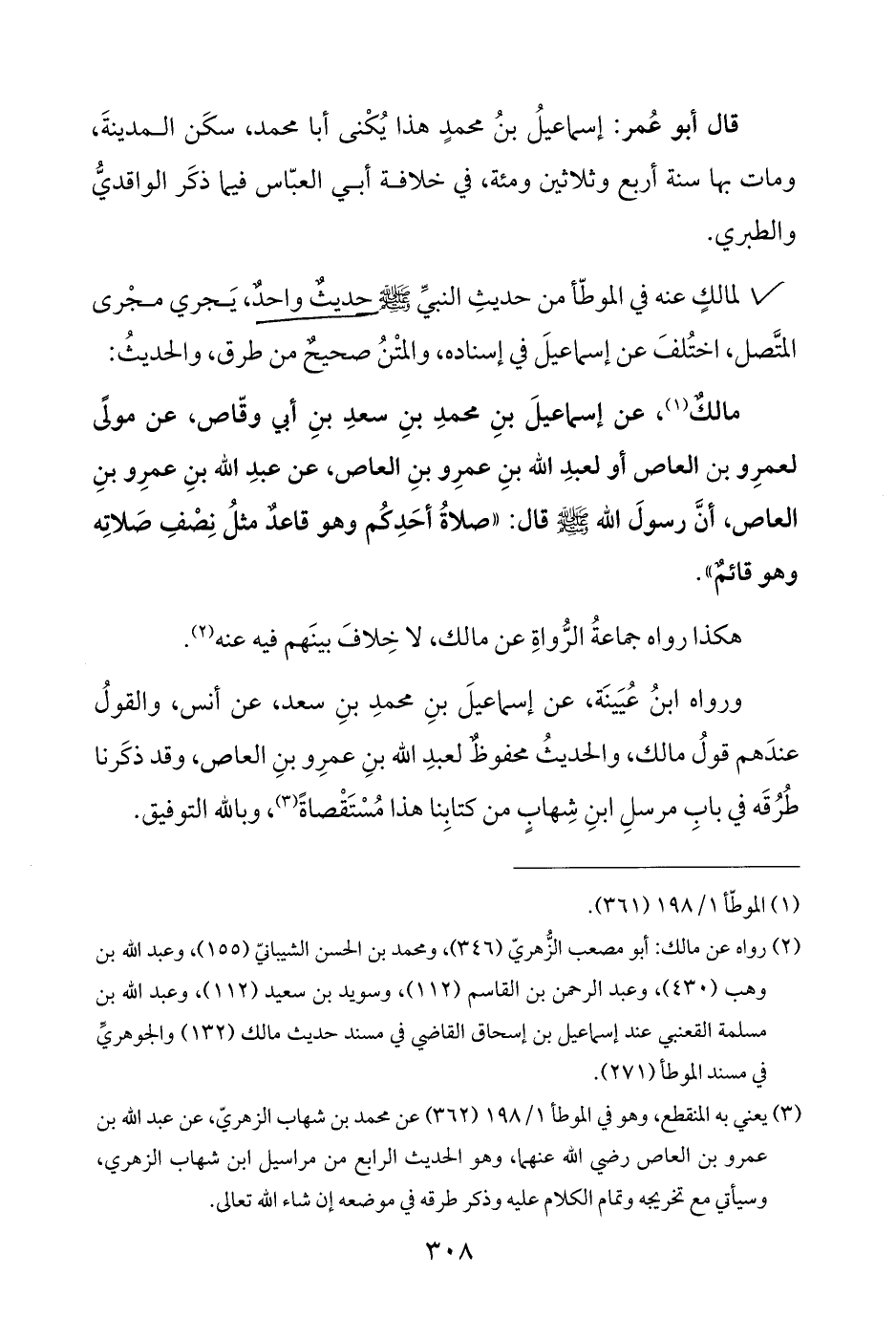 مالكٌ (¬١)، عن إسماعيلَ بنِ محمدِ بنِ سعدِ بنِ أبي وقّاص، عن مولًى لعمرِو بن العاص أو لعبدِ اللَّه بنِ عمرِو بنِ العاص، عن عبدِ اللَّه بنِ عمرِو بنِ العاص، أنَّ رسولَ اللَّه -صلى اللَّه عليه وسلم- قال: "صلاةُ أحَدِكُم وهو قاعدٌ مثلُ نِصْفِ صَلاتِه وهو قائمٌ".