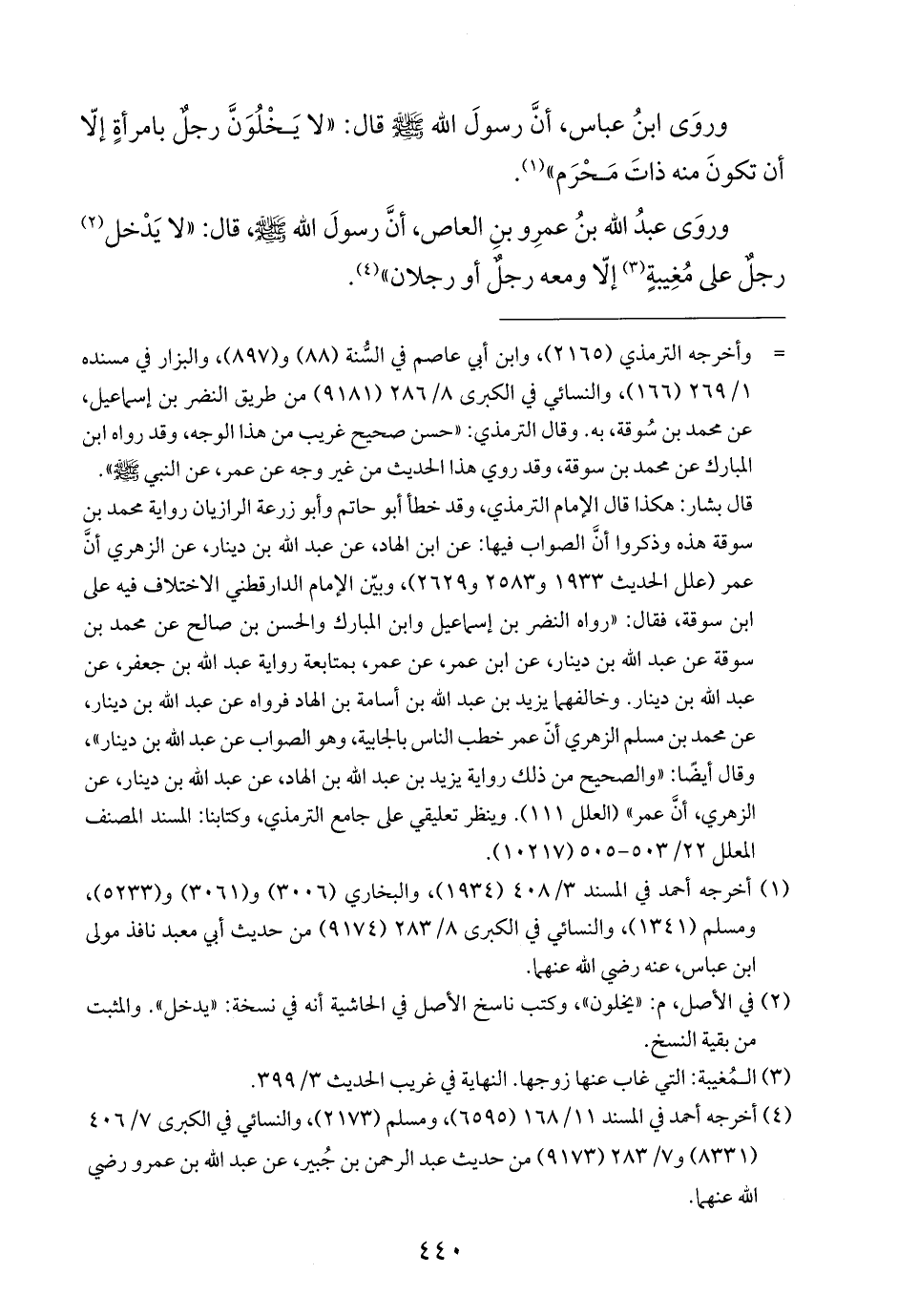 وروَى عبدُ اللَّه بنُ عمرِو بنِ العاص، أنَّ رسولَ اللَّه -صلى اللَّه عليه وسلم-، قال: "لا يَدْخل (¬٢) رجلٌ على مُغِيبةٍ (¬٣) إلّا ومعه رجلٌ أو رجلان" (¬٤).