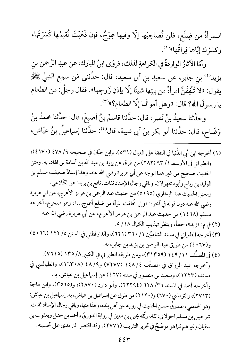 وأمّا الآثارُ الواردةُ في الكراهةِ لذلك، فروَى ابنُ المبارك، عن عبدِ الرَّحمن بنِ يزيد (¬٢) بنِ جابر، عن سعيدِ بنِ أبي سعيد، قال: حدَّثني مَن سمِع النبيَّ -صلى اللَّه عليه وسلم- يقول: "لا تُنْفِقَنَّ امرأةٌ من بيتِها شيئًا إلّا بإذنِ زَوجِها". فقال رجلٌ: من الطعام يا رسولَ اللَّه؟ قال: "وهل أموالُنا إلّا الطعام؟ " (¬٣).