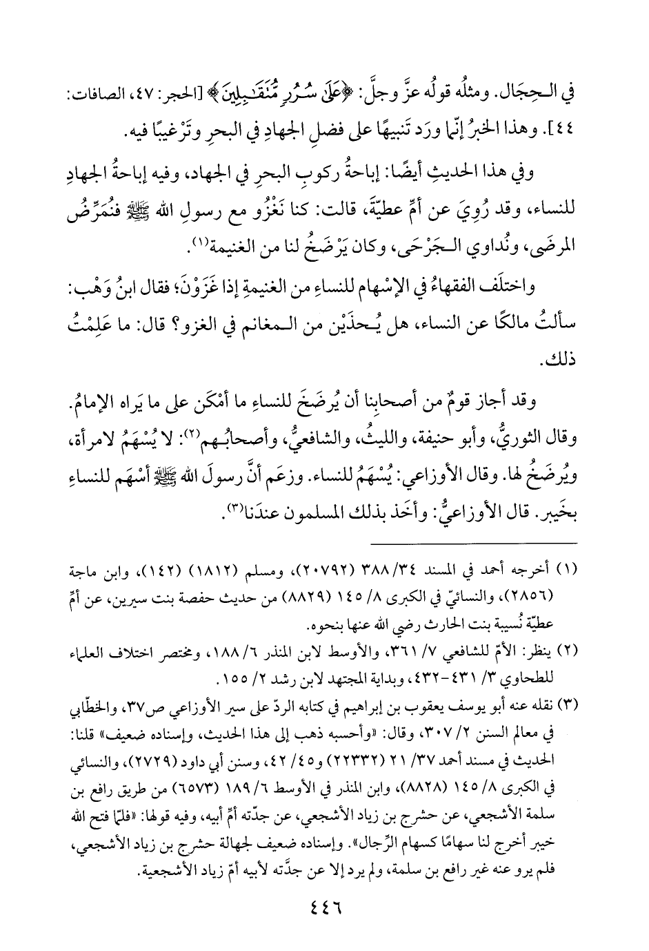 (¬٣) نقله عنه أبو يوسف يعقوب بن إبراهيم في كتابه الردّ على سير الأوزاعي ص ٣٧، والخطّابي في معالم السنن ٢/ ٣٠٧، وقال: "وأحسبه ذهب إلى هذا الحديث، وإسناده ضعيف" قلنا: الحديث في مسند أحمد ٢١/ ٣٧ (٢٢٣٣٢) و ٤٥/ ٤٢، وسنن أبي داود (٢٧٢٩)، والنسائي في الكبرى ٨/ ١٤٥ (٨٨٢٨)، وابن المنذر في الأوسط ٦/ ١٨٩ (٦٥٧٣) من طريق رافع بن سلمة الأشجعي، عن حشرج بن زياد الأشجعي، عن جدّته أمِّ أبيه، وفيه قولها: "فلمّا فتح اللَّه خيبر أخرج لنا سهامًا كسهام الرِّجال". وإسناده ضعيف لجهالة حشرج بن زياد الأشجعي، فلم يرو عنه غير رافع بن سلمة، ولم يرد إلا عن جدَّته لأبيه أمّ زياد الأشجعية.