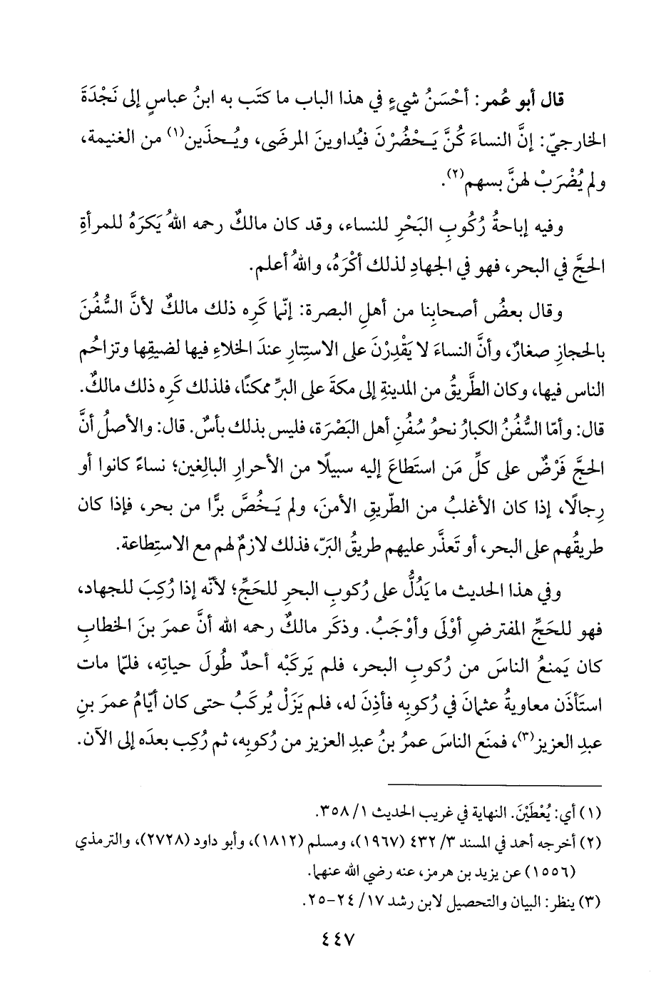 وقال بعضُ أصحابِنا من أهلِ البصرة: إنّما كَرِه ذلك مالكٌ لأنَّ السُّفُنَ بالحجازِ صغارٌ، وأنَّ النساءَ لا يَقْدِرْنَ على الاستِتارِ عندَ الخلاءِ فيها لضيقِها وتزاحُم الناس فيها، وكان الطَّريقُ من المدينةِ إلى مكةَ على البرِّ ممكنًا، فلذلك كَرِه ذلك مالكٌ. قال: وأمّا السُّفُنُ الكبارُ نحوُ سُفُنِ أهل البَصْرَة، فليس بذلك بأسٌ. قال: والأصلُ أنَّ الحجَّ فَرْضٌ على كلِّ مَن استَطاعَ إليه سبيلًا من الأحرارِ البالِغين؛ نساءً كانوا أو رِجالًا، إذا كان الأغلبُ من الطّريقِ الأمنَ، ولم يَخُصَّ برًّا من بحر، فإذا كان طريقُهم على البحر، أو تَعذَّر عليهم طريقُ البَرّ، فذلك لازمٌ لهم مع الاستِطاعة.