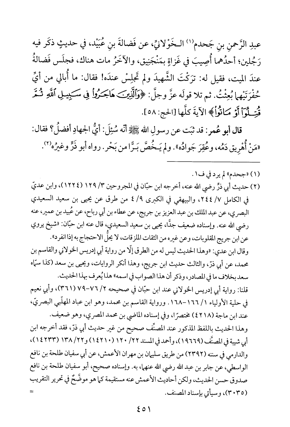 عبدِ الرَّحمنِ بنِ جَحدم (¬١) الخَوْلانيِّ، عن فَضالةَ بنِ عُبَيْد، في حديثٍ ذكَر فيه رَجُلين؛ أحدُهما أُصيبَ في غَزاةٍ بمَنْجَنِيق، والآخَرُ مات هناك، فجلَس فَضالةُ عندَ الميت، فقيل له: ترَكْتَ الشَّهيدَ ولم تَجلِسْ عندَه! فقال: ما أُبالي من أيِّ حُفْرَتَيْهما بُعِثْتُ. ثم تلا قولَه عزَّ وجلَّ: {وَالَّذِينَ هَاجَرُوا فِي سَبِيلِ اللَّهِ ثُمَّ قُتِلُوا أَوْ مَاتُوا} الآيةَ كلَّها [الحج: ٥٨].