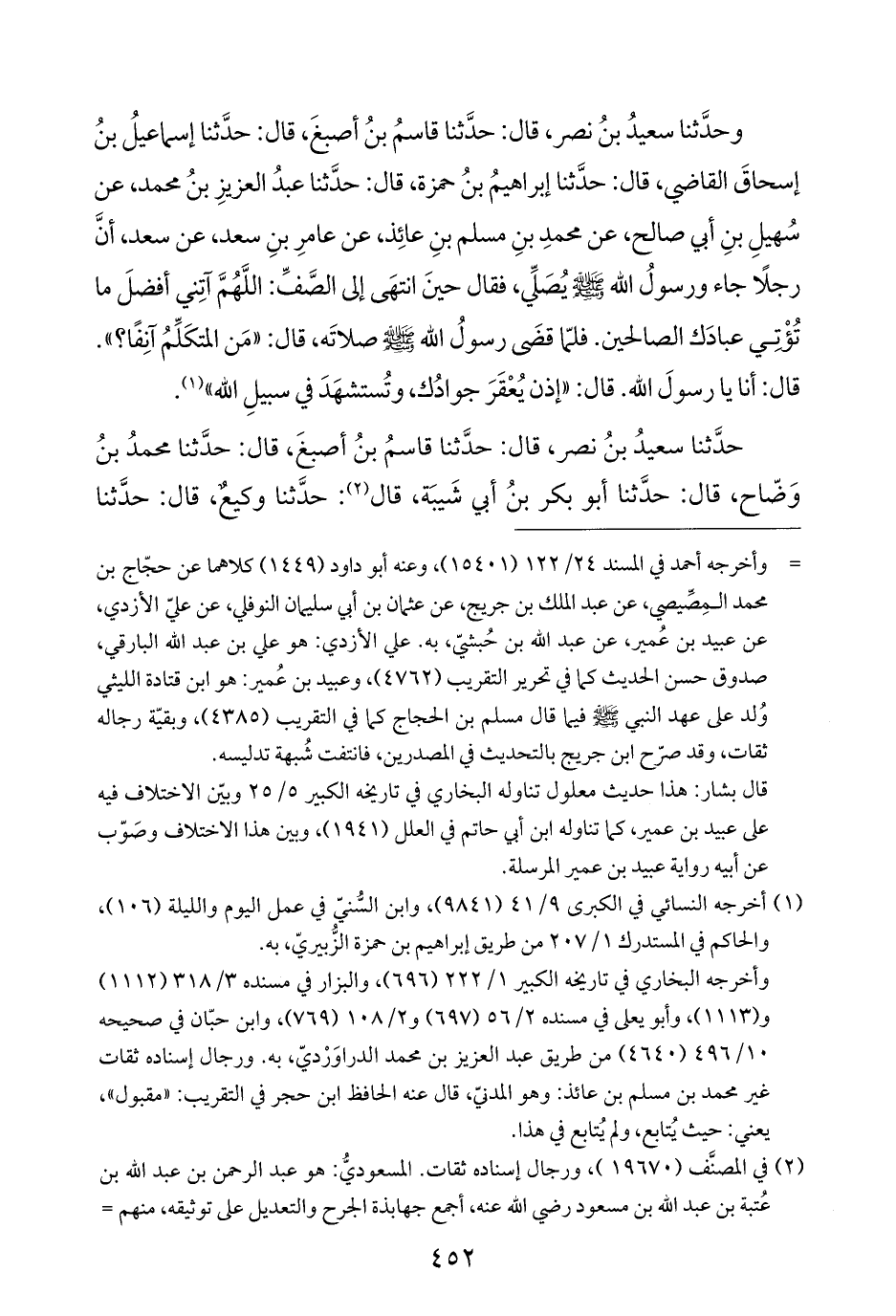 وحدَّثنا سعيدُ بنُ نصر، قال: حدَّثنا قاسمُ بنُ أصبغَ، قال: حدَّثنا إسماعيلُ بنُ إسحاقَ القاضي، قال: حدَّثنا إبراهيمُ بنُ حمزة، قال: حدَّثنا عبدُ العزيزِ بنُ محمد، عن سُهيلِ بنِ أبي صالح، عن محمدِ بنِ مسلم بنِ عائِذ، عن عامرِ بنِ سعد، عن سعد، أنَّ رجلًا جاء ورسولُ اللَّه -صلى اللَّه عليه وسلم- يُصَلِّي، فقال حينَ انتهَى إلى الصَّفِّ: اللَّهُمَّ آتِني أفضلَ ما تُؤْتِي عبادَك الصالحين. فلمّا قضَى رسولُ اللَّه -صلى اللَّه عليه وسلم- صلاتَه، قال: "مَن المتكَلِّمُ آنِفًا؟ ". قال: أنا يا رسولَ اللَّه. قال: "إذن يُعْقَرَ جوادُك، وتُستشهَدَ في سبيلِ اللَّه" (¬١).