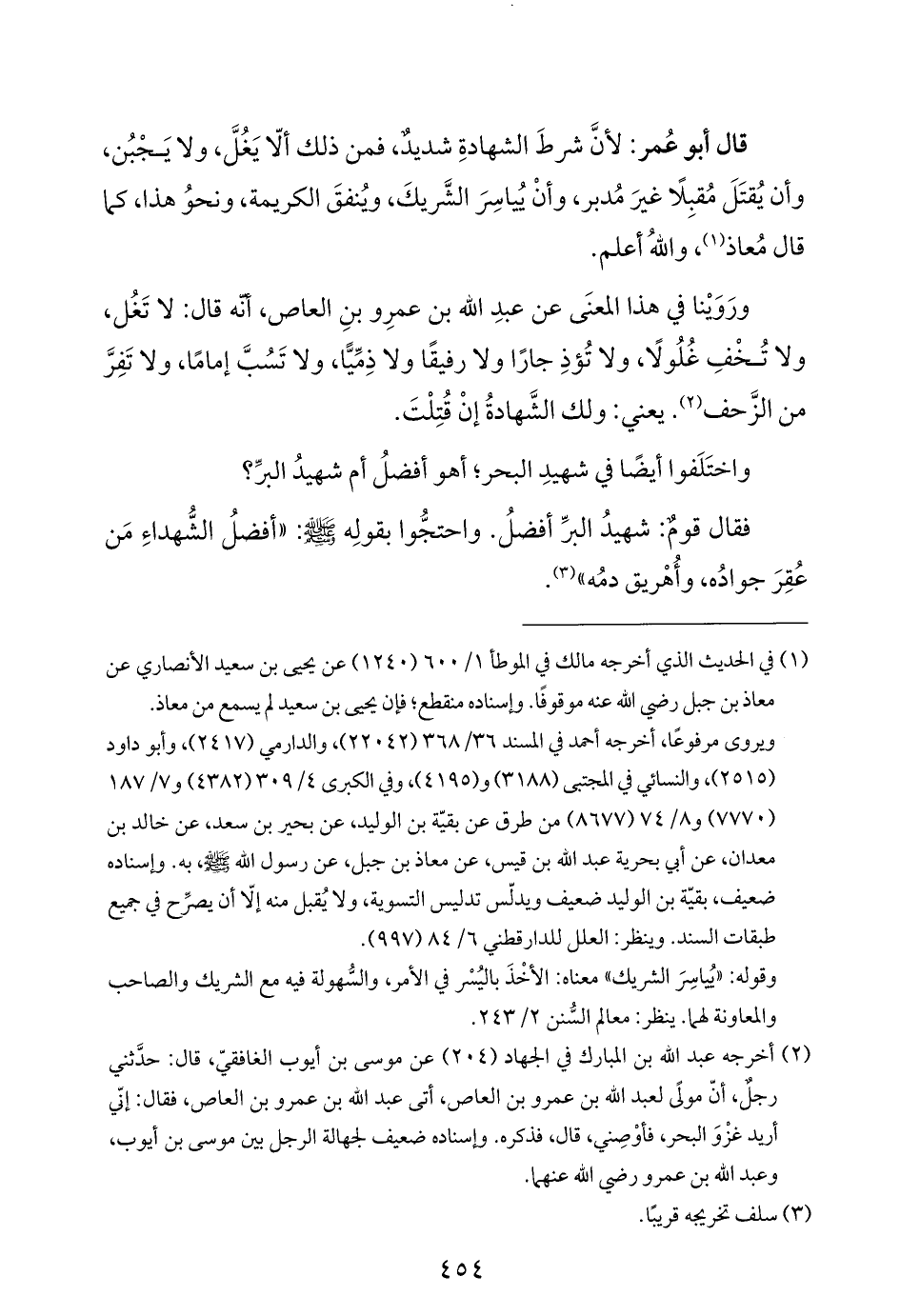 (¬١) في الحديث الذي أخرجه مالك في الموطأ ١/ ٦٠٠ (١٢٤٠) عن يحيى بن سعيد الأنصاري عن معاذ بن جبل رضي اللَّه عنه موقوفًا. وإسناده منقطع؛ فإن يحيى بن سعيد لم يسمع من معاذ.