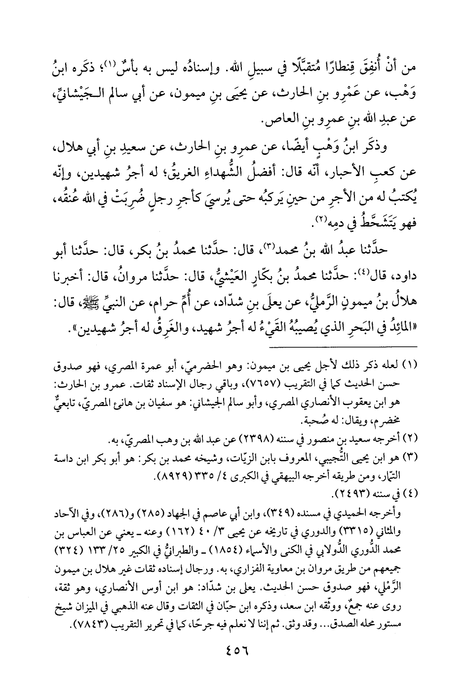 حدَّثنا عبدُ اللَّه بنُ محمد (¬٣)، قال: حدَّثنا محمدُ بنُ بكر، قال: حدَّثنا أبو داود، قال (¬٤): حدَّثنا محمدُ بنُ بكّارٍ العَيْشيُّ، قال: حدَّثنا مروانُ، قال: أخبرنا هلالُ بنُ ميمونٍ الرَّمليُّ، عن يعلَى بنِ شدّاد، عن أُمِّ حرام، عن النبيِّ -صلى اللَّه عليه وسلم-، قال: "المائِدُ في البَحرِ الذي يُصيبُهُ القَيْءُ له أجرُ شهيد، والغَرِقُ له أجرُ شهيدين".