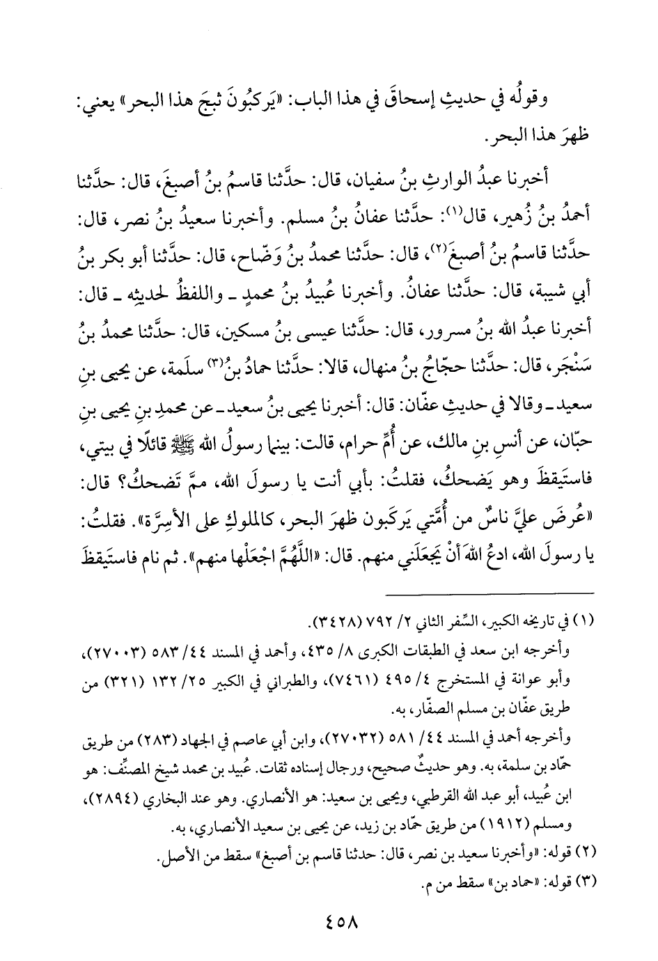 أخبرنا عبدُ الوارثِ بنُ سفيان، قال: حدَّثنا قاسمُ بنُ أصبغَ، قال: حدَّثنا أحمدُ بنُ زُهير، قال (¬١): حدَّثنا عفانُ بنُ مسلم. وأخبرنا سعيدُ بنُ نصر، قال: حدَّثنا قاسمُ بنُ أصبغَ (¬٢)، قال: حدَّثنا محمدُ بنُ وَضّاح، قال: حدَّثنا أبو بكر بنُ أبي شيبة، قال: حدَّثنا عفانُ. وأخبرنا عُبيدُ بنُ محمدٍ -واللفظُ لحديثِه- قال: أخبرنا عبدُ اللَّه بنُ مسرور، قال: حدَّثنا عيسى بنُ مسكين، قال: حدَّثنا محمدُ بنُ سَنْجَر، قال: حدَّثنا حجّاجُ بنُ منهال، قالا: حدَّثنا حمادُ بنُ (¬٣) سلَمة، عن يحيى بنِ سعيد -وقالا في حديثِ عفّان: قال: أخبرنا يحيى بنُ سعيد- عن محمدِ بنِ يحيى بنِ حبّان، عن أنسِ بنِ مالك، عن أُمِّ حرام، قالت: بينما رسولُ اللَّه -صلى اللَّه عليه وسلم- قائلًا في بيتي، فاستَيقظَ وهو يَضحكُ، فقلتُ: بأبي أنت يا رسولَ اللَّه، ممَّ تَضحكُ؟ قال: "عُرضَ عليَّ ناسٌ من أُمَّتي يَركَبون ظهرَ البحر، كالملوكِ على الأسِرَّة". فقلتُ: يا رسولَ اللَّه، ادعُ اللَّهَ أنْ يَجعَلَني منهم. قال: "اللَّهُمَّ اجْعَلْها منهم". ثم نام فاستَيقظَ