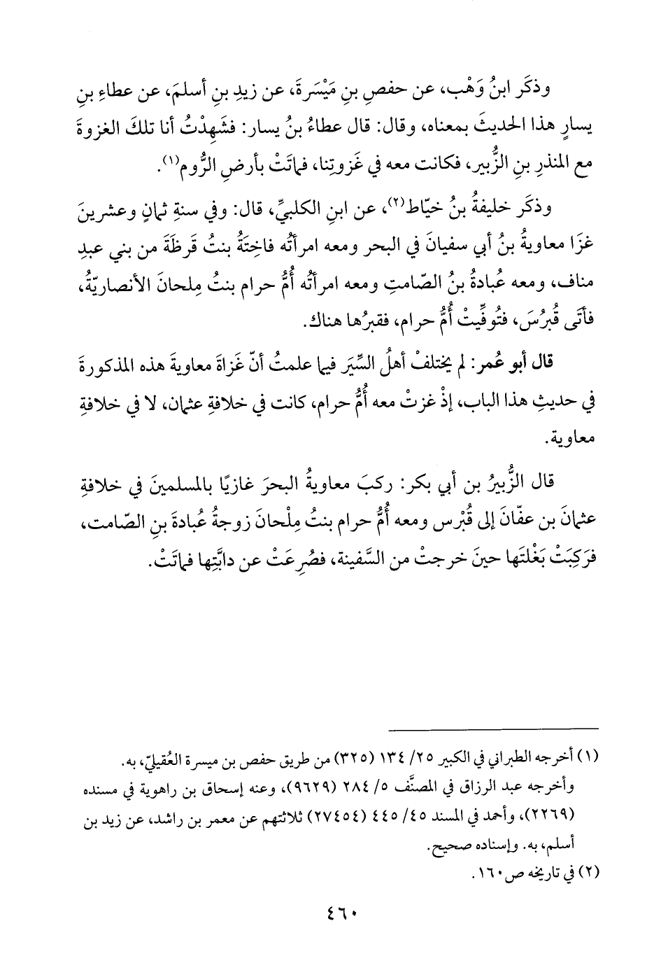 قال أبو عُمر: لم يختلفْ أهلُ السِّيَر فيما علمتُ أنّ غَزاةَ معاويةَ هذه المذكورةَ في حديثِ هذا الباب، إذْ غزتْ معه أُمُّ حرام، كانت في خلافةِ عثمان، لا في خلافةِ معاوية.