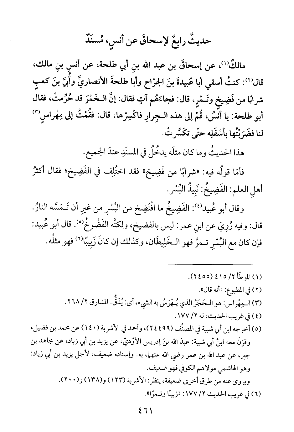 مالكٌ (¬١)، عن إسحاقَ بن عبد اللَّه بنِ أبي طلحة، عن أنسِ بنِ مالك، قال (¬٢): كنتُ أسقي أبا عُبيدةَ بنَ الجرّاح وأبا طلحةَ الأنصاريَّ وأُبيَّ بنَ كعبٍ شرابًا من فَضِيخٍ وتَمْرٍ، قال: فجاءَهُم آتٍ فقال: إنَّ الخَمْرَ قد حُرِّمتْ، فقال أبو طلحة: يا أنسُ، قُمْ إلى هذه الجِرارِ فاكْسِرْها، قال: فقُمْتُ إلى مِهْراسٍ (¬٣) لنا فضَرَبْتُها بأسْفَلِه حتّى تكَسَّرتْ.