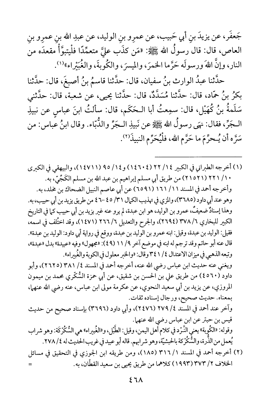 جَعفَر، عن يزيدَ بنِ أبي حَبيب، عن عمرِو بنِ الوليد، عن عبدِ اللَّه بنِ عمرِو بنِ العاص، قال: قال رسولُ اللَّه -صلى اللَّه عليه وسلم-: "مَن كذَب عليَّ متعمِّدًا فلْيتبوَّأْ مقعدَه من النار، وإنَّ اللَّهَ ورسولَه حَرَّما الخمرَ، والميسرَ، والكُوبةَ، والغُبَيْراء" (¬١).