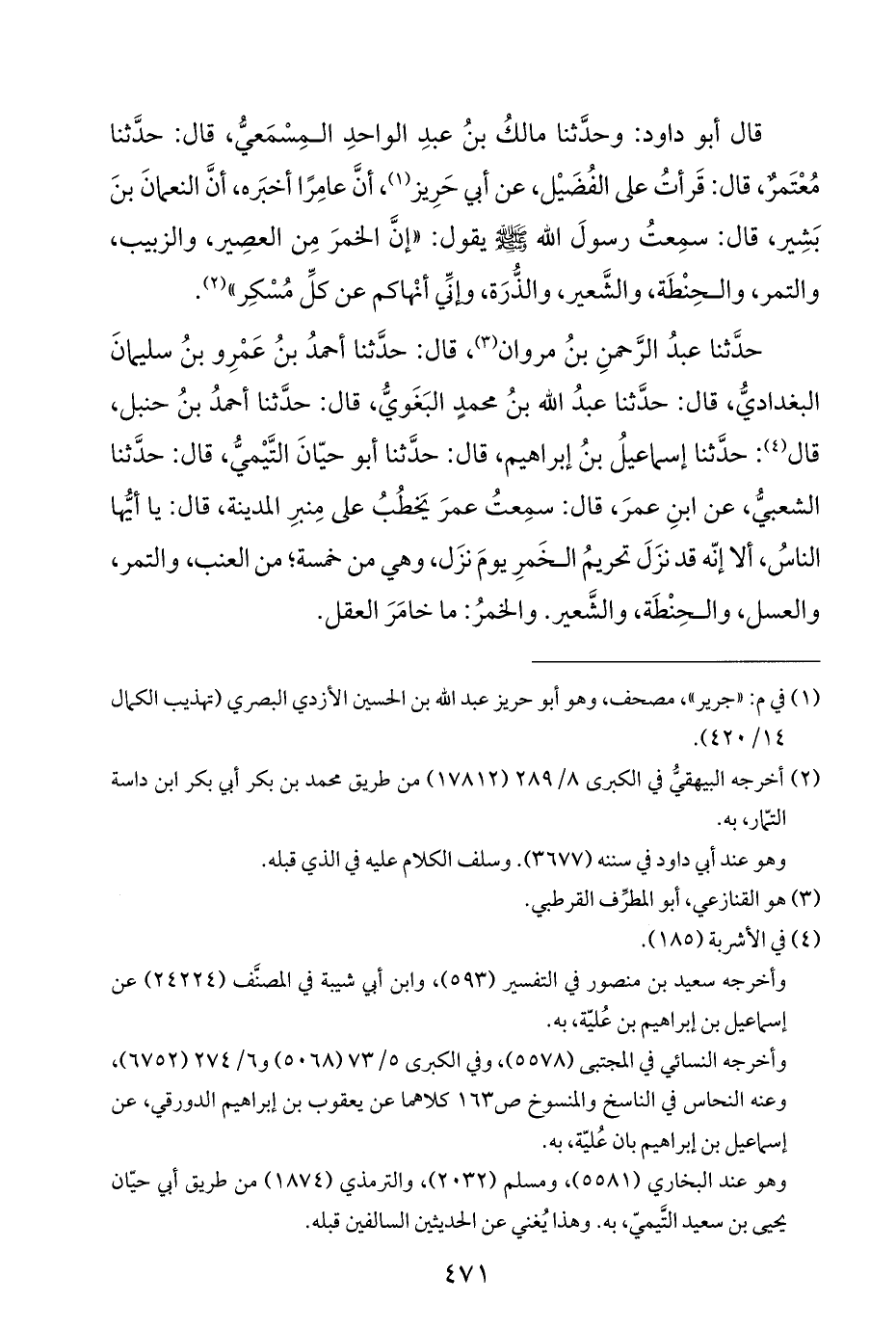 قال أبو داود: وحدَّثنا مالكُ بنُ عبدِ الواحدِ المِسْمَعيُّ، قال: حدَّثنا مُعْتَمرٌ، قال: قَرأتُ على الفُضَيْل، عن أبي حَرِيز (¬١)، أنَّ عامِرًا أخبَره، أنَّ النعمانَ بنَ بَشِير، قال: سمِعتُ رسولَ اللَّه -صلى اللَّه عليه وسلم- يقول: "إنَّ الخمرَ مِن العصِير، والزبيب، والتمر، والحِنْطَة، والشَّعير، والذُّرَة، وإنِّي أنْهاكم عن كلِّ مُسْكِر" (¬٢).