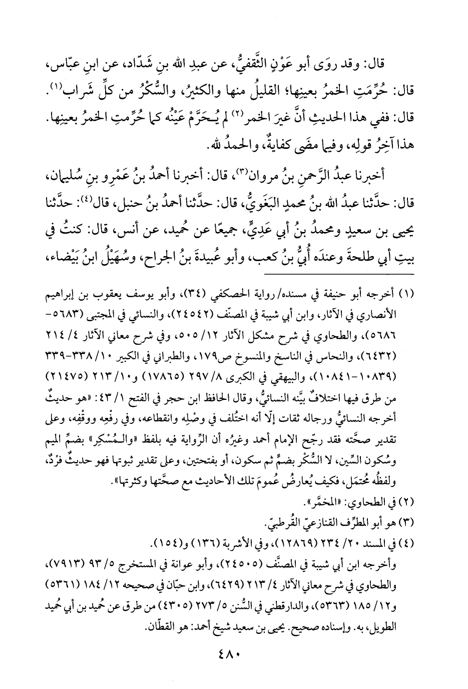 (¬١) أخرجه أبو حنيفة في مسنده/ رواية الحصكفي (٣٤)، وأبو يوسف يعقوب بن إبراهيم الأنصاري في الآثار، وابن أبي شيبة في المصنّف (٢٤٥٤٢)، والنسائي في المجتبى (٥٦٨٣ - ٥٦٨٦)، والطحاوي في شرح مشكل الآثار ١٢/ ٥٠٥، وفي شرح معاني الآثار ٤/ ٢١٤ (٦٤٣٢)، والنحاس في الناسخ والمنسوخ ص ١٧٩، والطبراني في الكبير ١٠/ ٣٣٨ - ٣٣٩ (١٠٨٣٩ - ١٠٨٤١)، والبيهقي في الكبرى ٨/ ٢٩٧ (١٧٨٦٥) و ١٠/ ٢١٣ (٢١٤٧٥) من طرق فيها اختلافٌ بيَّنه النسائيُّ، وقال الحافظ ابن حجر في الفتح ١/ ٤٣: "هو حديثٌ أخرجه النسائيُّ ورجاله ثقات إلّا أنه اختُلف في وصْلِه وانقطاعه، وفي رفْعِه ووقْفِه، وعلى تقدير صحَّته فقد رجّح الإمام أحمد وغيرُه أن الرِّواية فيه بلفظ "والمُسْكِر" بضمِّ الميم وسُكون السِّين، لا السُّكْر بضمٍّ ثم سكون، أو بفتحتين، وعلى تقدير ثبوتها فهو حديثٌ فرْدٌ، ولفظُه مُحتمَل، فكيف يُعارضُ عُمومَ تلك الأحاديث مع صحَّتها وكثرتها".