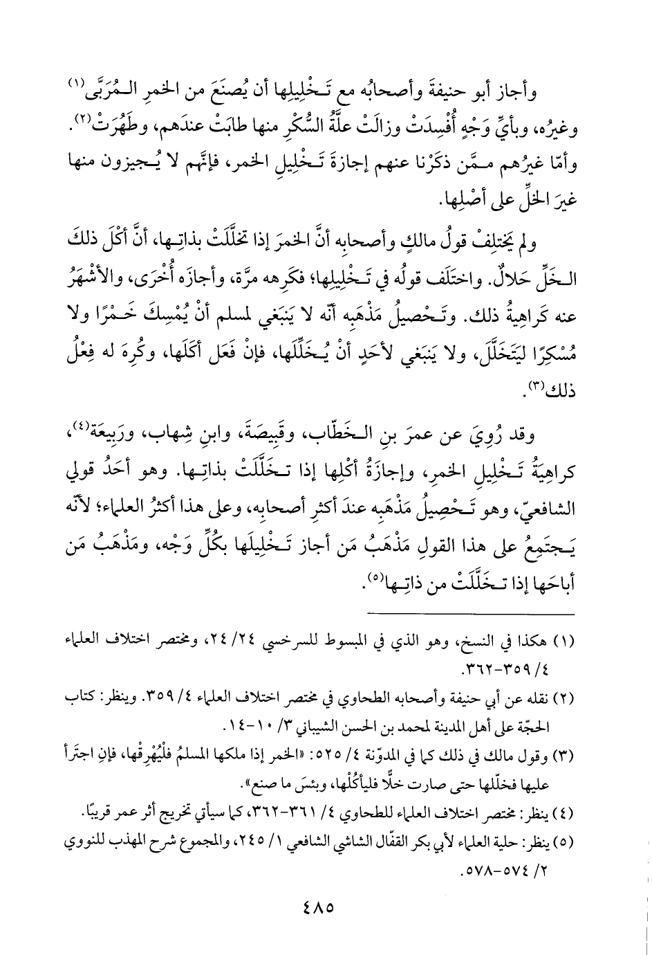(¬٣) وقول مالك في ذلك كما في المدوّنة ٤/ ٥٢٥: "الخمر إذا ملكها المسلمُ فلْيُهْرِقْها، فإنِ اجتَرأ عليها فخلّلها حتى صارت خلًّا فليأكُلْها، وبئسَ ما صنع".