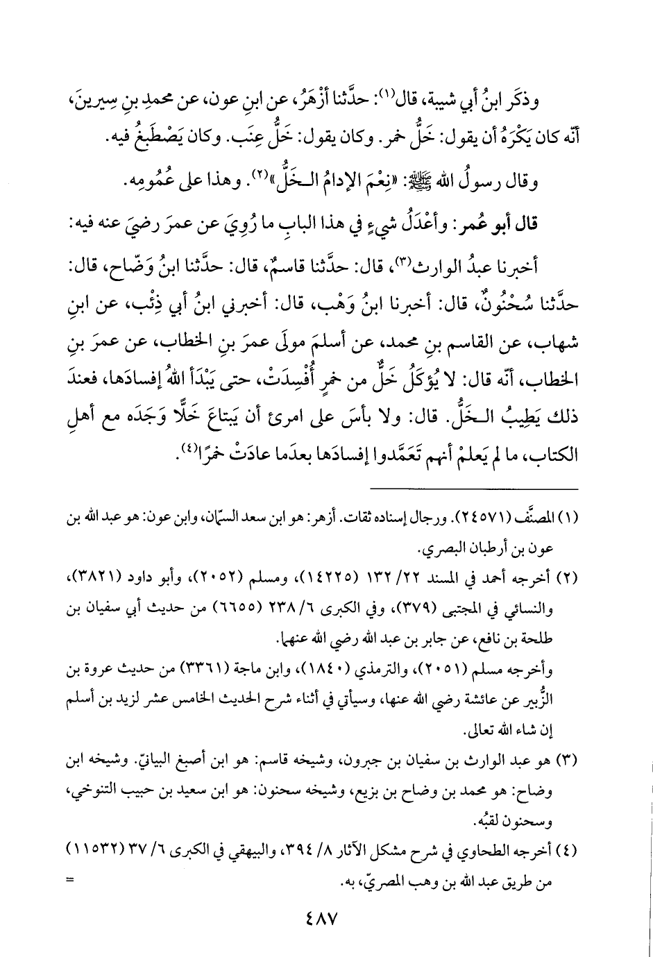أخبرنا عبدُ الوارث (¬٣)، قال: حدَّثنا قاسمٌ، قال: حدَّثنا ابنُ وَضّاح، قال: حدَّثنا سُحْنُونٌ، قال: أخبرنا ابنُ وَهْب، قال: أخبرني ابنُ أبي ذِئْب، عن ابنِ شهاب، عن القاسم بنِ محمد، عن أسلمَ مولَى عمرَ بنِ الخطاب، عن عمرَ بنِ الخطاب، أنّه قال: لا يُؤكَلُ خَلٌّ من خمرٍ أُفْسِدَتْ، حتى يَبْدَأ اللَّهُ إفسادَها، فعندَ ذلك يَطِيبُ الخَلُّ. قال: ولا بأسَ على امرئ أن يَبتاعَ خَلًّا وَجَدَه مع أهلِ الكتاب، ما لم يَعلمْ أنهم تَعَمَّدوا إفسادَها بعدَما عادَتْ خمرًا (¬٤).