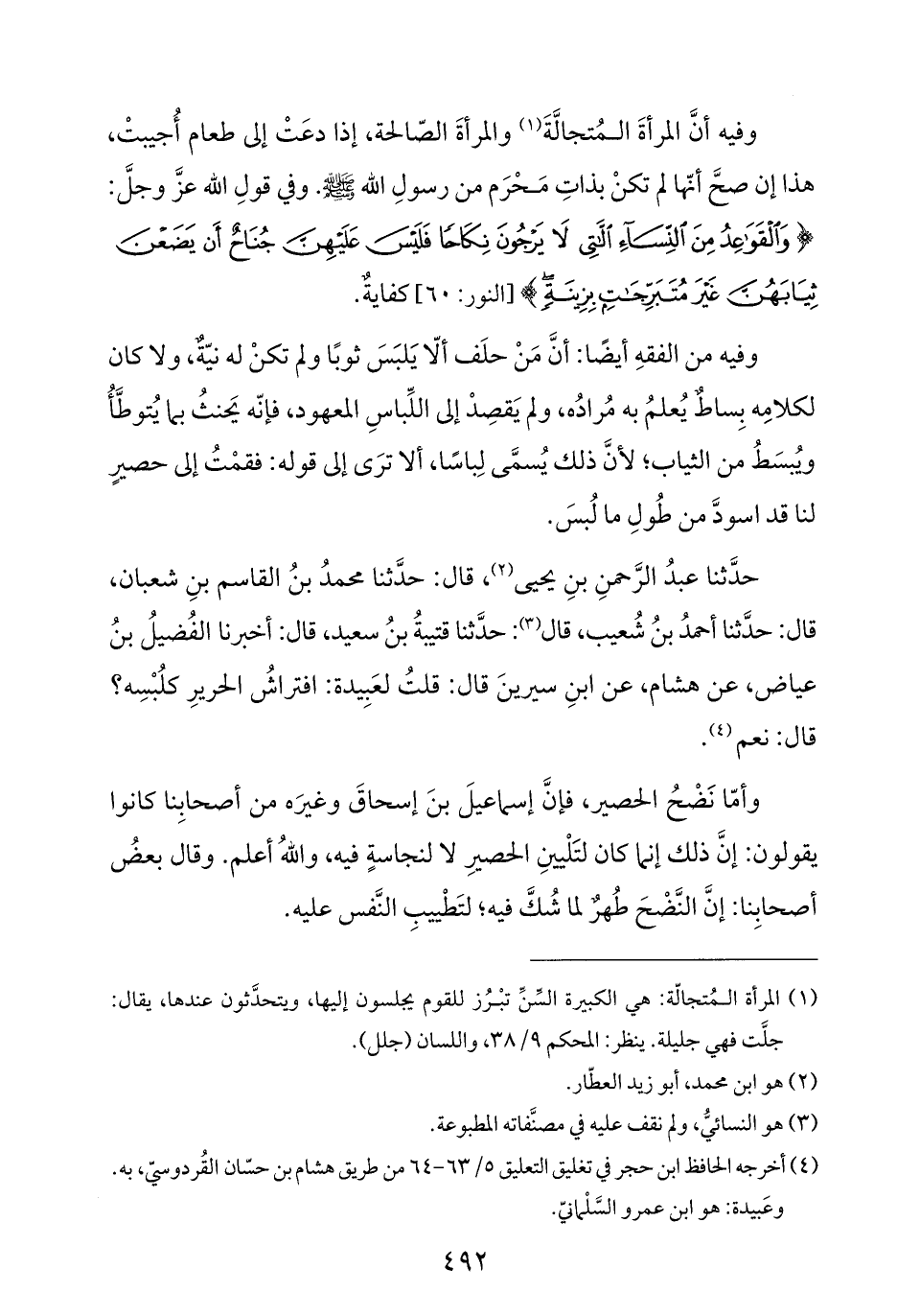 حدَّثنا عبدُ الرَّحمنِ بنِ يحيى (¬٢)، قال: حدَّثنا محمدُ بنُ القاسم بنِ شعبان، قال: حدَّثنا أحمدُ بنُ شُعيب، قال (¬٣): حدَّثنا قتيبةُ بنُ سعيد، قال: أخبرنا الفُضيلُ بنُ عياض، عن هشام، عن ابنِ سيرينَ قال: قلتُ لعَبِيدة: افتراشُ الحريرِ كلُبْسِه؟ قال: نعم (¬٤).