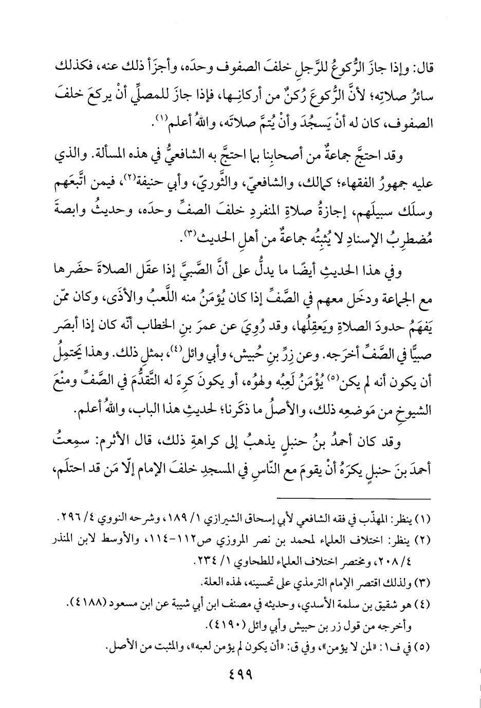 وقد احتجَّ جماعةٌ من أصحابِنا بما احتجَّ به الشافعيُّ في هذه المسألة. والذي عليه جمهورُ الفقهاء؛ كمالك، والشافعيّ، والثَّوريّ، وأبي حنيفة (¬٢)، فيمن اتَّبعَهم وسلَك سبيلَهم، إجازةُ صلاةِ المنفردِ خلفَ الصفِّ وحدَه، وحديثُ وابصةَ مُضطرِبُ الإسنادِ لا يُثبِتُه جماعةٌ من أهلِ الحديث (¬٣).