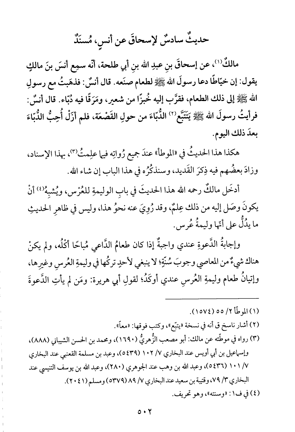 مالكٌ (¬١)، عن إسحاقَ بنِ عبدِ اللَّه بنِ أبي طلحة، أنَّه سمِع أَنسَ بنَ مالكٍ يقول: إن خيّاطًا دعا رسولَ اللَّه -صلى اللَّه عليه وسلم- لطعام صنَعه. قال أنسٌ: فذهَبتُ مع رسولِ اللَّه -صلى اللَّه عليه وسلم- إلى ذلك الطعام، فقرَّب إليه خُبزًا من شعير، ومَرَقًا فيه دُبّاء. قال أنسٌ: فرأيتُ رسولَ اللَّه -صلى اللَّه عليه وسلم- يَتَتَبَّع (¬٢) الدُّبّاءَ من حولِ القَصْعَة، فلم أزَلْ أُحِبُّ الدُّبّاءَ بعدَ ذلك اليوم.