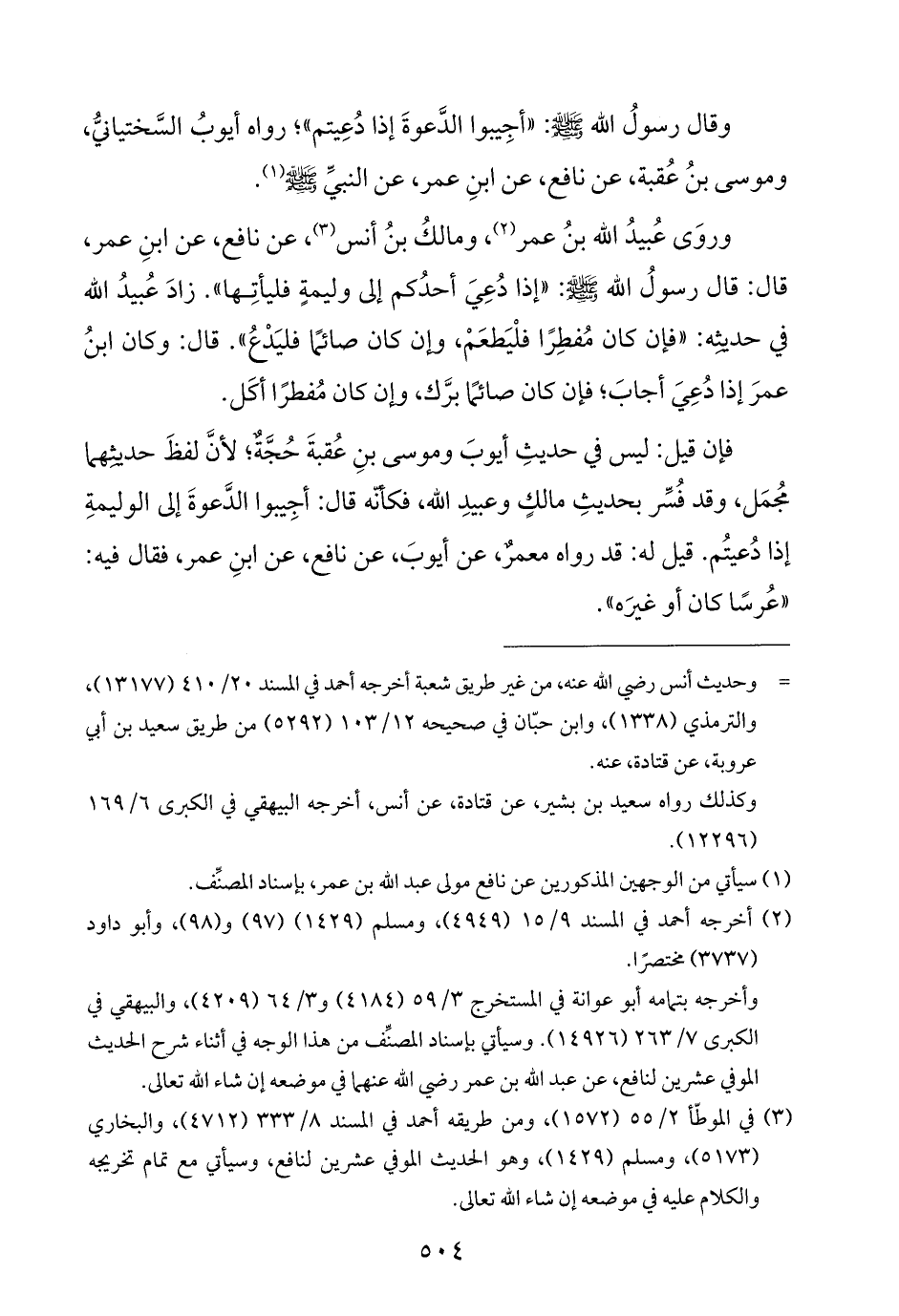 وقال رسولُ اللَّه -صلى اللَّه عليه وسلم-: "أجِيبوا الدَّعوةَ إذا دُعِيتم"؛ رواه أيوبُ السَّختيانيُّ، وموسى بنُ عُقبة، عن نافع، عن ابنِ عمر، عن النبيِّ -صلى اللَّه عليه وسلم- (¬١).
