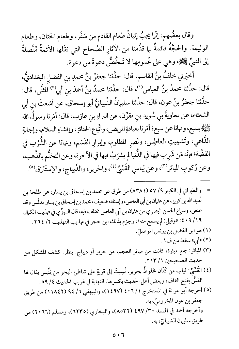 أخبَرني خلفُ بنُ القاسم، قال: حدَّثنا جعفرُ بنُ محمدِ بنِ الفضلِ البغداديُّ، قال: حدَّثنا محمدُ بنُ العباس (¬١)، قال: حدَّثنا محمدُ بنُ أحمدَ بنِ أبي (¬٢) المثنَّى، قال: حدَّثنا جعفرُ بنُ عون، قال: حدَّثنا سليمانُ الشَّيبانيُّ أبو إسحاق، عن أشعثَ بنِ أبي الشعثاء، عن معاويةَ بنِ سُويدِ بنِ مقرِّن، عن البراءِ بنِ عازب، قال: أمَرنا رسولُ اللَّه -صلى اللَّه عليه وسلم- بسبع، ونهانا عن سبع، أمَرنا بعيادةِ المريض، واتِّباع الجنائز، وإفشاءِ السلام، وإجابةِ الدَّاعي، وتَشمِيتِ العاطِس، ونَصرِ المظلوم، وإبرارِ القَسَم، ونهانا عن الشُّرْب في الفضَّة؛ فإنّه مَن شرِب فيها في الدُّنيا لم يشرَبْ فيها في الآخرة، وعن التختُّم بالذَّهب، وعن رُكوبِ المياثر (¬٣)، وعن لِباسِ القَسِّيِّ (¬٤)، والحرير، والدِّيباج، والإستَبْرَق (¬٥).