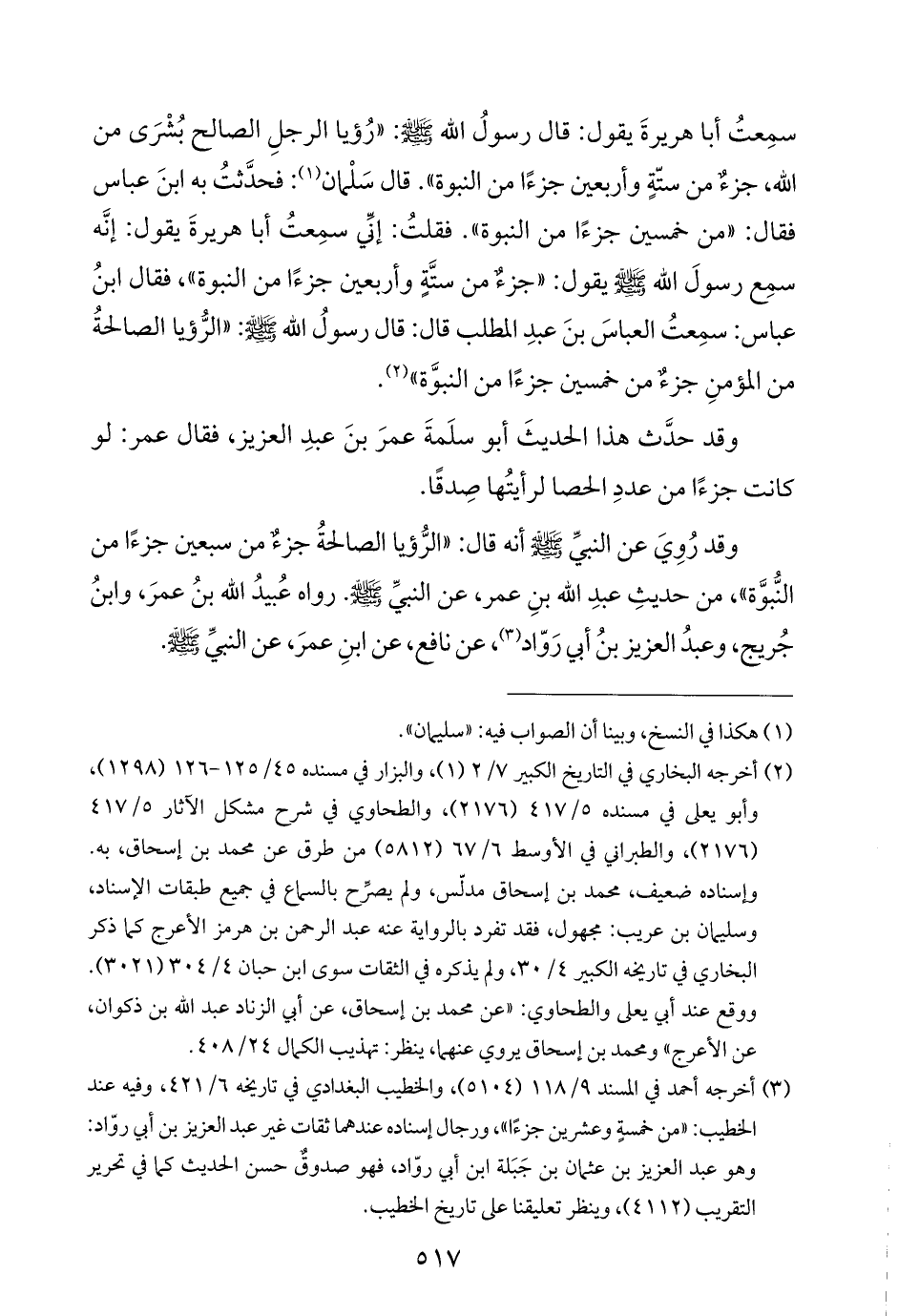 سمِعتُ أبا هريرةَ يقول: قال رسولُ اللَّه -صلى اللَّه عليه وسلم-: "رُؤيا الرجلِ الصالح بُشْرَى من اللَّه، جزءٌ من ستّةٍ وأربعين جزءًا من النبوة". قال سَلْمان (¬١): فحدَّثتُ به ابنَ عباس فقال: "من خمسين جزءًا من النبوة". فقلتُ: إنِّي سمِعتُ أبا هريرةَ يقول: إنَّه سمِع رسولَ اللَّه -صلى اللَّه عليه وسلم- يقول: "جزءٌ من ستَّةٍ وأربعين جزءًا من النبوة"، فقال ابنُ عباس: سمِعتُ العباسَ بنَ عبدِ المطلب قال: قال رسولُ اللَّه -صلى اللَّه عليه وسلم-: "الرُّؤيا الصالحةُ من المؤمنِ جزءٌ من خمسين جزءًا من النبوَّة" (¬٢).