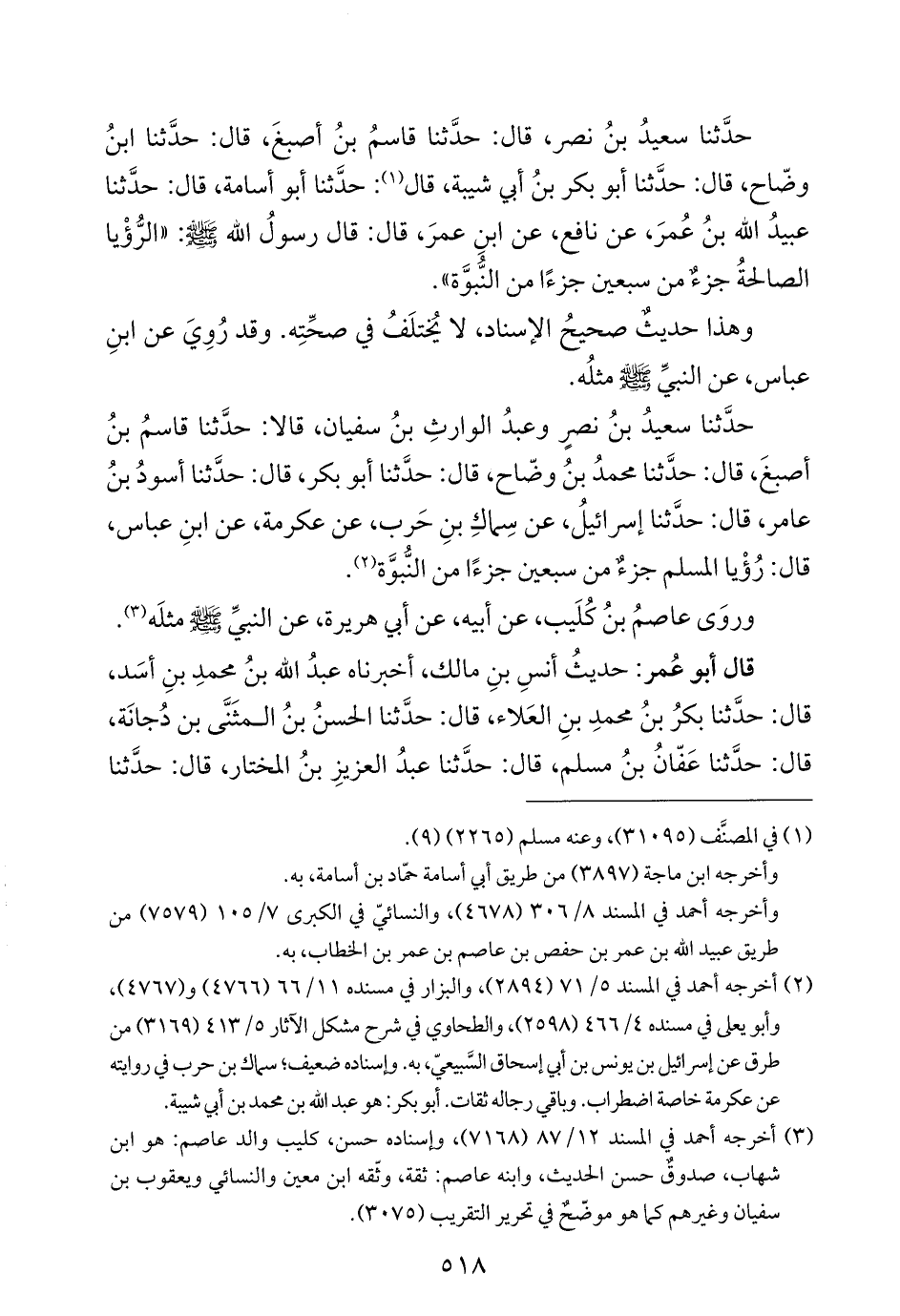 حدَّثنا سعيدُ بنُ نصر، قال: حدَّثنا قاسمُ بنُ أصبغَ، قال: حدَّثنا ابنُ وضّاح، قال: حدَّثنا أبو بكر بنُ أبي شيبة، قال (¬١): حدَّثنا أبو أسامة، قال: حدَّثنا عبيدُ اللَّه بنُ عُمرَ، عن نافع، عن ابنِ عمرَ، قال: قال رسولُ اللَّه -صلى اللَّه عليه وسلم-: "الرُّؤْيا الصالحةُ جزءٌ من سبعين جزءًا من النُّبوَّة".