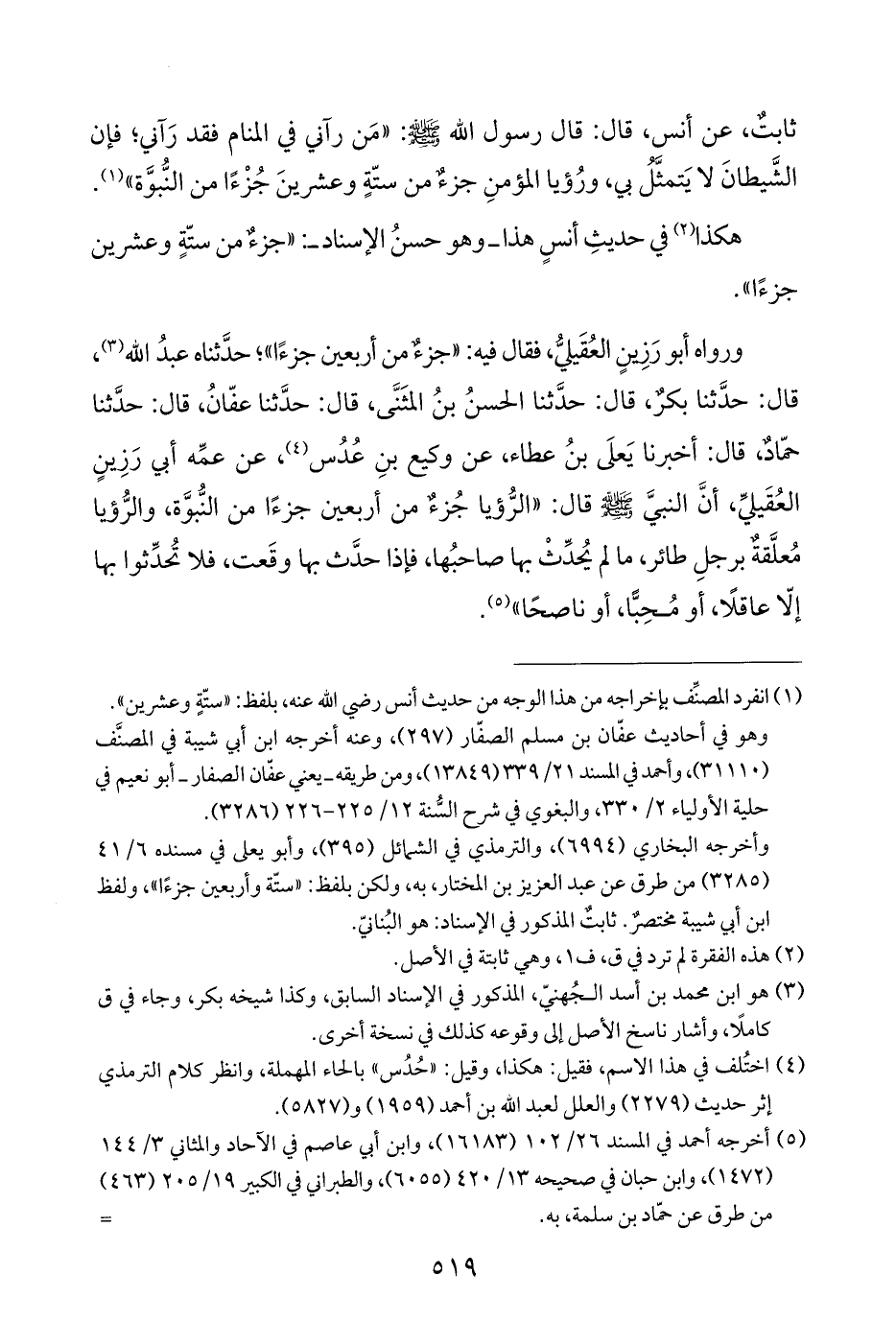 ثابتٌ، عن أنس، قال: قال رسول اللَّه -صلى اللَّه عليه وسلم-: "مَن رآني في المنام فقد رَآني؛ فإن الشَّيطانَ لا يَتمثَّلُ بي، ورُؤَيَا المؤمنِ جزءٌ من ستّةٍ وعشرينَ جُزْءًا من النُّبوَّة" (¬١).