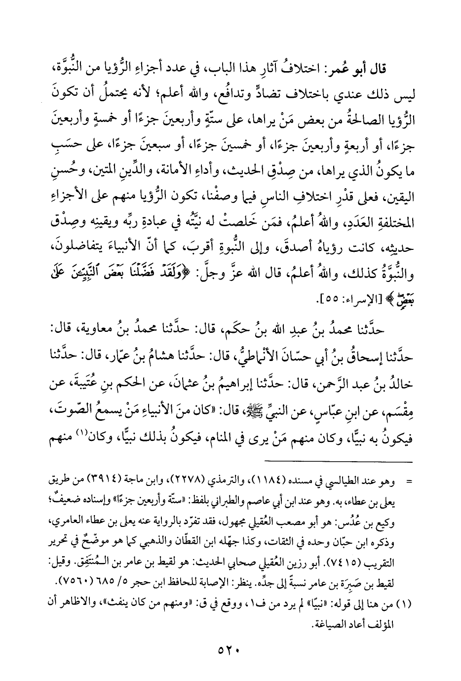 قال أبو عُمر: اختلافُ آثارِ هذا الباب، في عدد أجزاءِ الرُّؤيا من النُّبوَّة، ليس ذلك عندي باختلاف تضادٍّ وتدافُع، واللَّه أعلم؛ لأنه يحتملُ أن تكونَ الرُّؤيا الصالحةُ من بعض مَنْ يراها، على ستّةٍ وأربعينَ جزءًا أو خمسةٍ وأربعينَ جزءًا، أو أربعةٍ وأربعينَ جزءًا، أو خمسينَ جزءًا، أو سبعينَ جزءًا، على حسَبِ ما يكونُ الذي يراها، من صِدْقِ الحديث، وأداءِ الأمانة، والدِّينِ المتين، وحُسنِ اليقين، فعلى قدْرِ اختلافِ الناسِ فيما وصفْنا، تكون الرُّؤيا منهم على الأجزاءِ المختلفةِ العَدَدِ، واللَّهُ أعلمُ، فمَن خَلصتْ له نيَّتُه في عبادةِ ربِّه ويقينِه وصِدْق حديثه، كانت رؤياهُ أصدقَ، وإلى النُّبوةِ أقربَ، كما أنّ الأنبياءَ يتفاضلونَ، والنُّبوَّةُ كذلك، واللَّهُ أعلمُ، قال اللَّه عزَّ وجلَّ: {وَلَقَدْ فَضَّلْنَا بَعْضَ النَّبِيِّينَ عَلَى بَعْضٍ} [الإسراء: ٥٥].